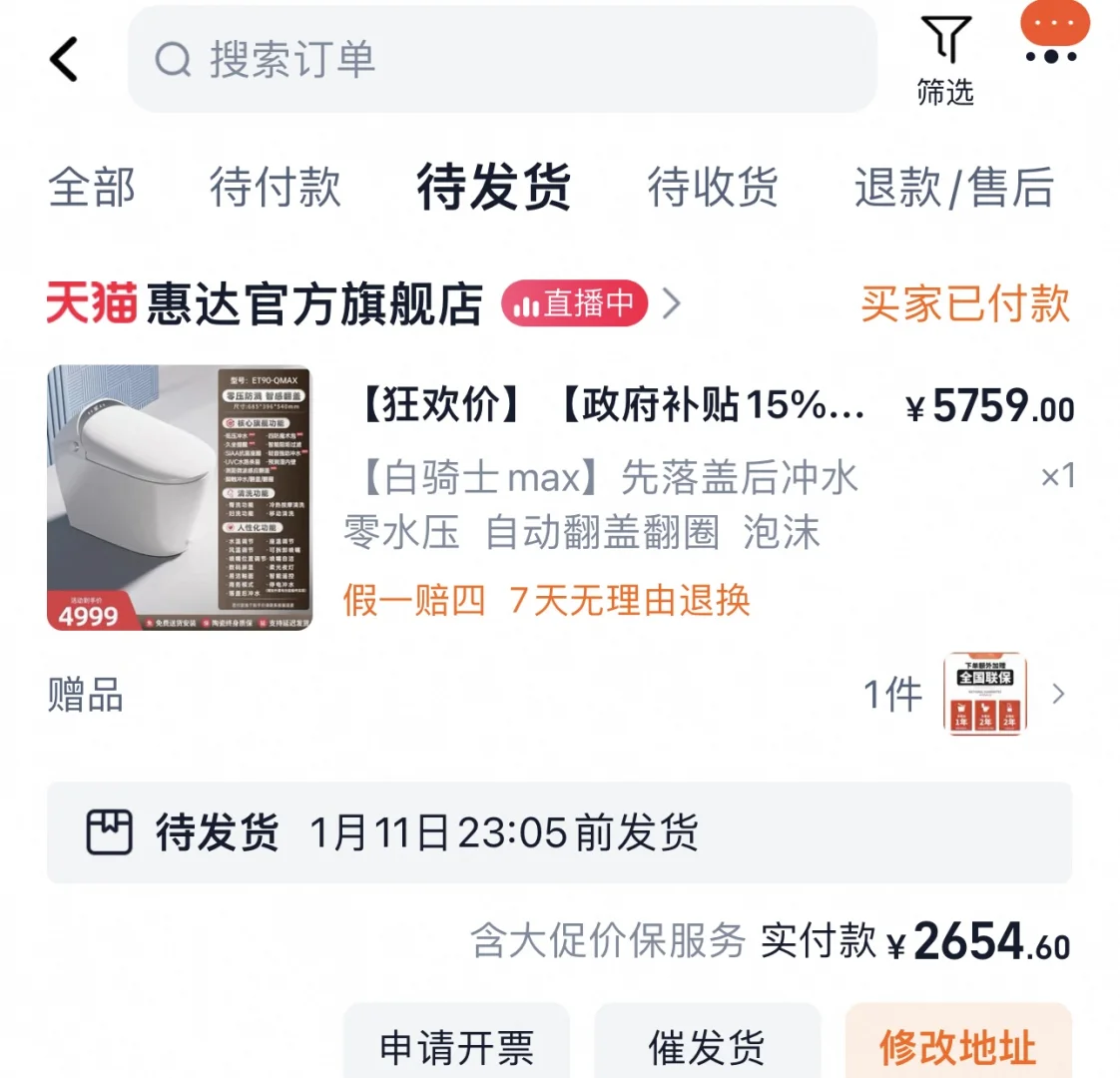 昨晚的战绩,跟着迷瞪团买的。马桶移位了1.5米,就怕堵,盲买迷瞪直播最贵的白骑士max,用了双12红包,最后再国补,2654.6拿下!