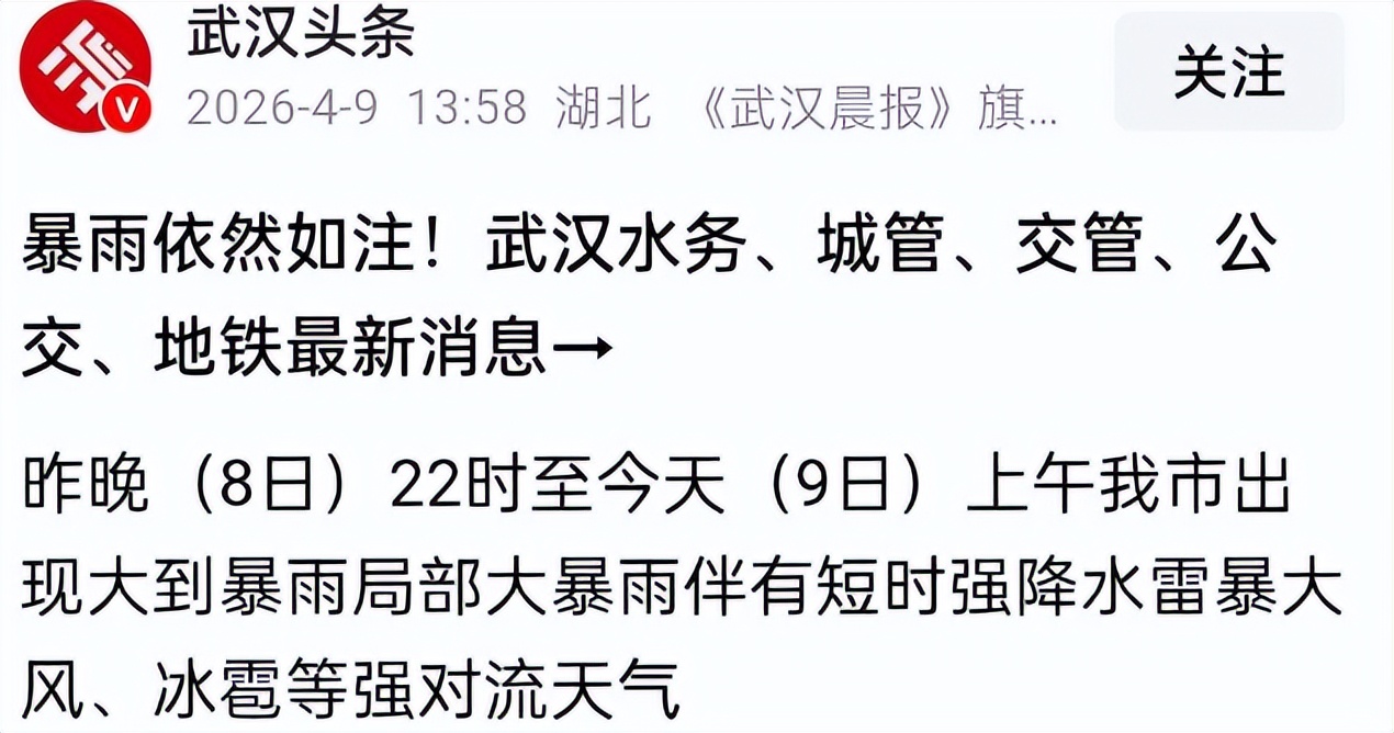 4月9日凌晨,武汉被一场打破季节常识的强对流天气彻底惊醒。狂风、暴雨、冰雹三重暴击席卷全城,最大阵风达13级,冰雹大如鹌鹑蛋、鸡蛋,砸得窗户噼啪作响,相关画面迅速刷屏社交平台,武汉深夜突降冰雹冲上热搜,《湖北日报》等媒体也对此进行了全方位报道。