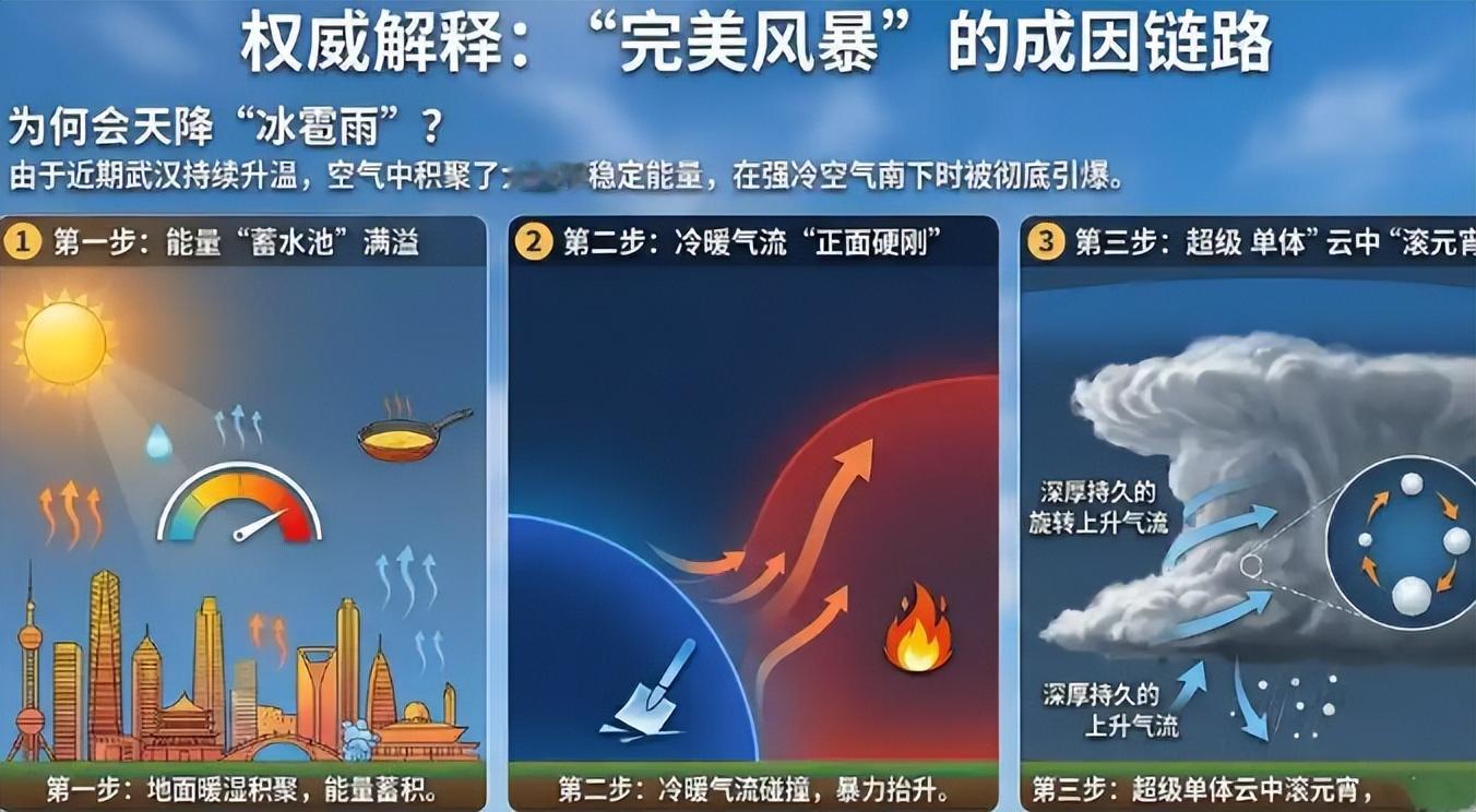 要搞懂这场极端天气,得先明白强对流天气的核心逻辑——上冷下暖的强烈垂直运动,这就像一口被加热到沸腾的油锅,只要有一点火星,就能炸得噼里啪啦。武汉这场狂风暴雨冰雹,就是典型的"底层热、上层冷"不稳定结构引发的大气"大爆炸"。
