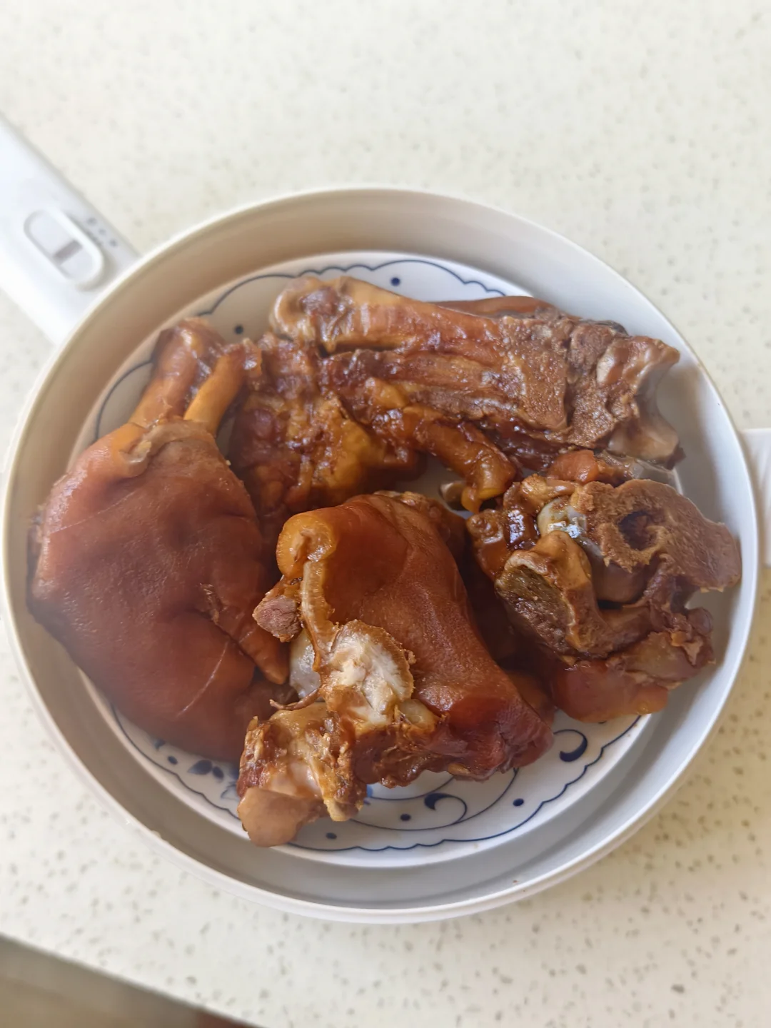 王老师六点半到家,在他回家前我卡着点把他爸妈从贵州带回来的猪脚热了,把李子拍扁撒辣椒粉腌了,点了北京烤鸭外卖。