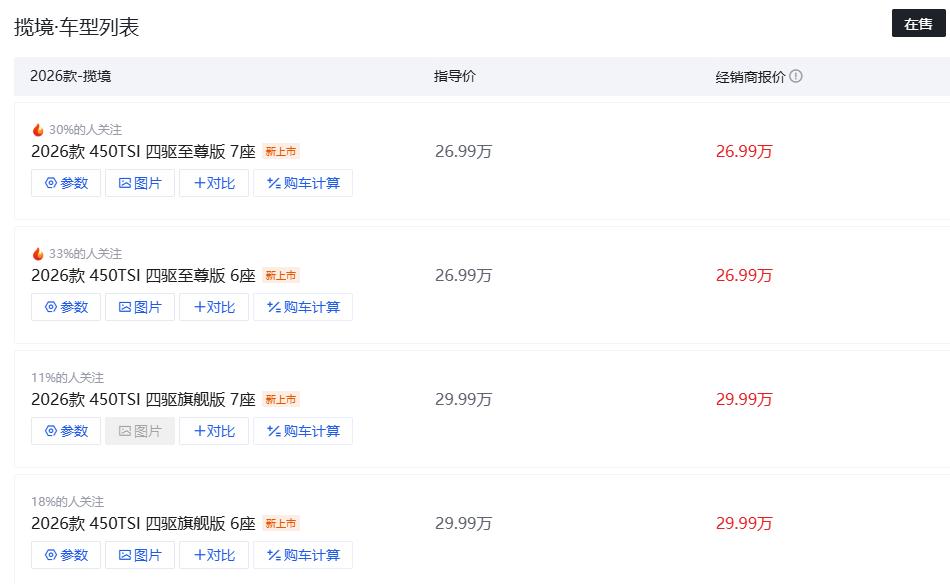 全新揽境这次共推出 4 款车型,6 座和 7 座同价,450 四驱至尊版售价 26.99 万元,450 四驱旗舰版售价 29.99 万元。从价格和配置来看,性价比还是不错的。如果你预算在 20 多万,想买一辆空间大、配置丰富、动力强的中大型 SUV,全新揽境是个值得考虑的选择。它在外观设计上有特色,内饰科技感足,空间实用性高,动力和智能辅助驾驶也都能满足日常和长途出行需求。不过每款车都有它的优缺点,在买车前,最好去 4S 店试驾一下,亲身感受感受,再结合自己的需求和预算做决定。