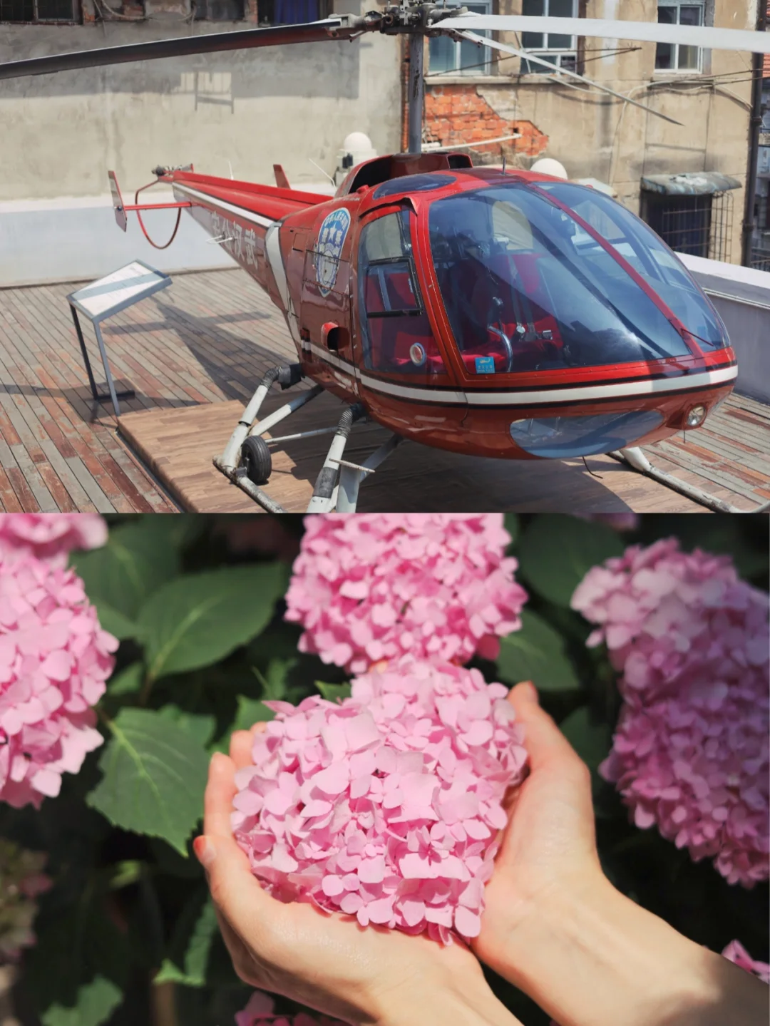 🍃门口还有一些绣球,开得很好;三楼停了一架直升机好酷