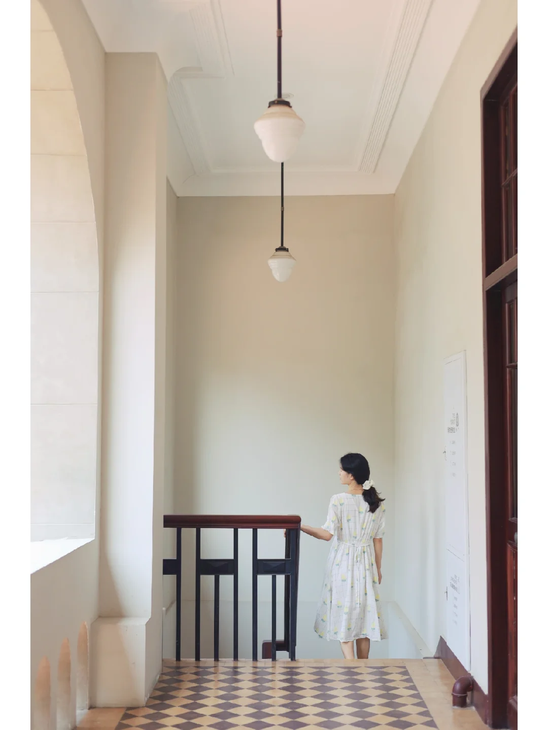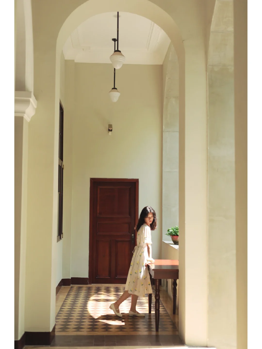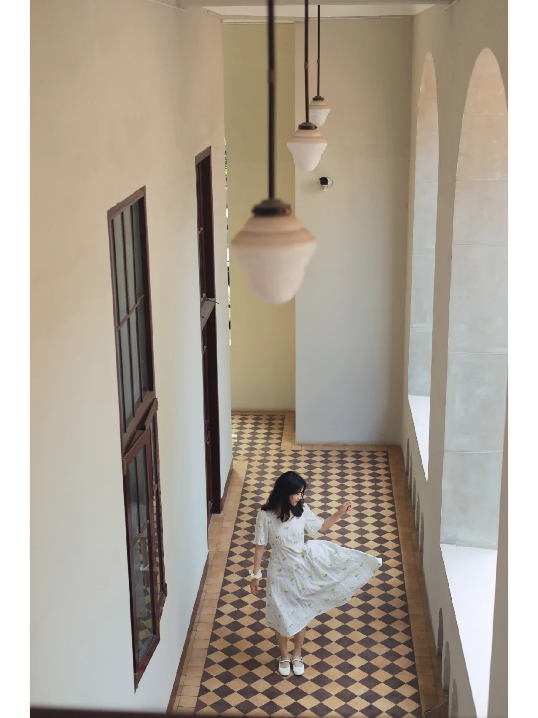 🍃整体风格很复古,几何图案拼花地板,拱形窗户搭配绿色梧桐好像一幅画