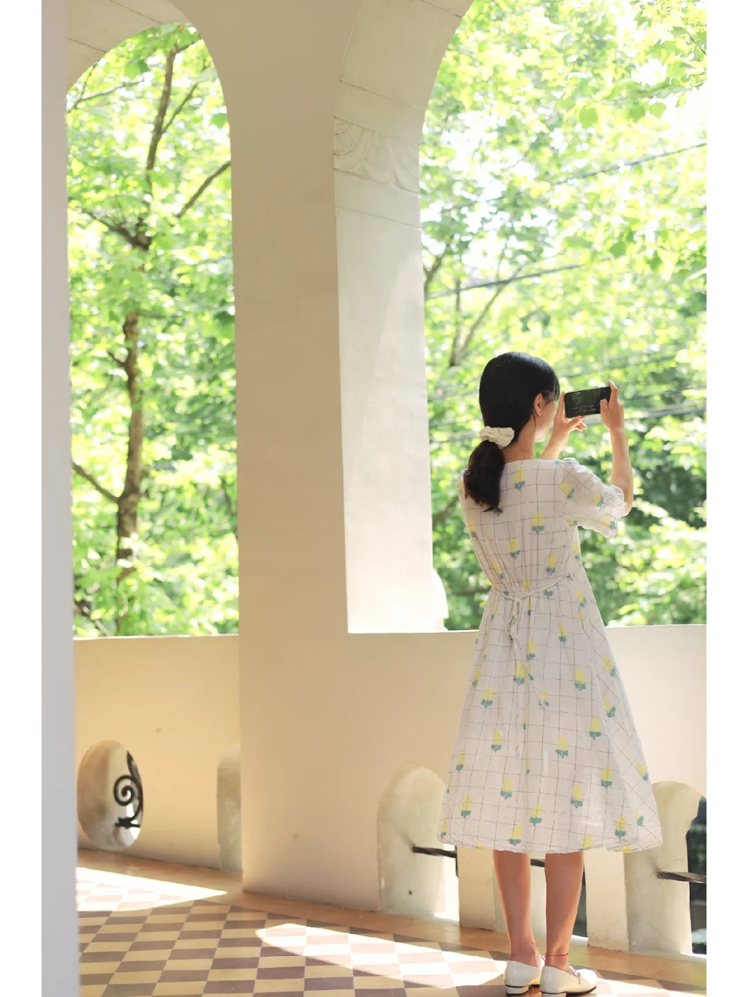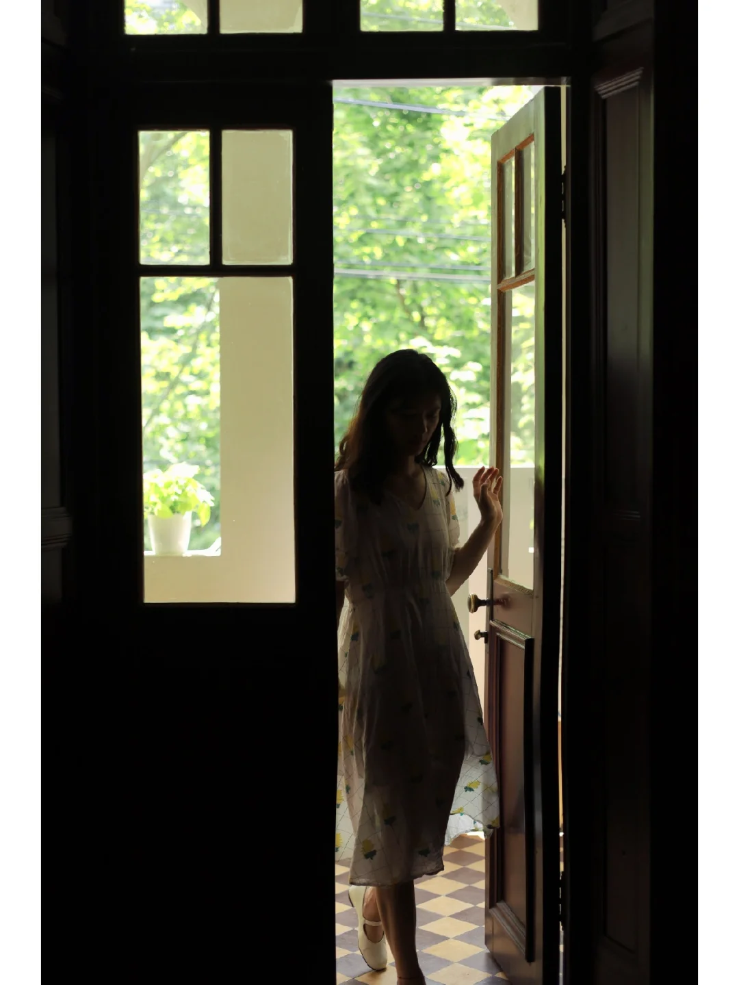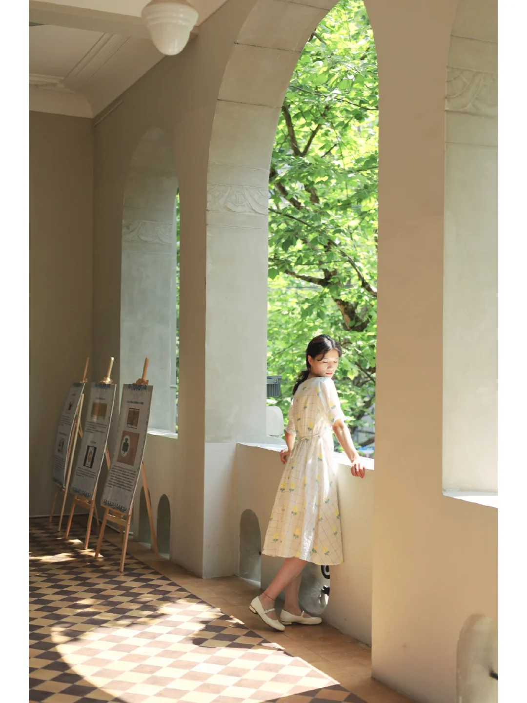🍃整体风格很复古,几何图案拼花地板,拱形窗户搭配绿色梧桐好像一幅画