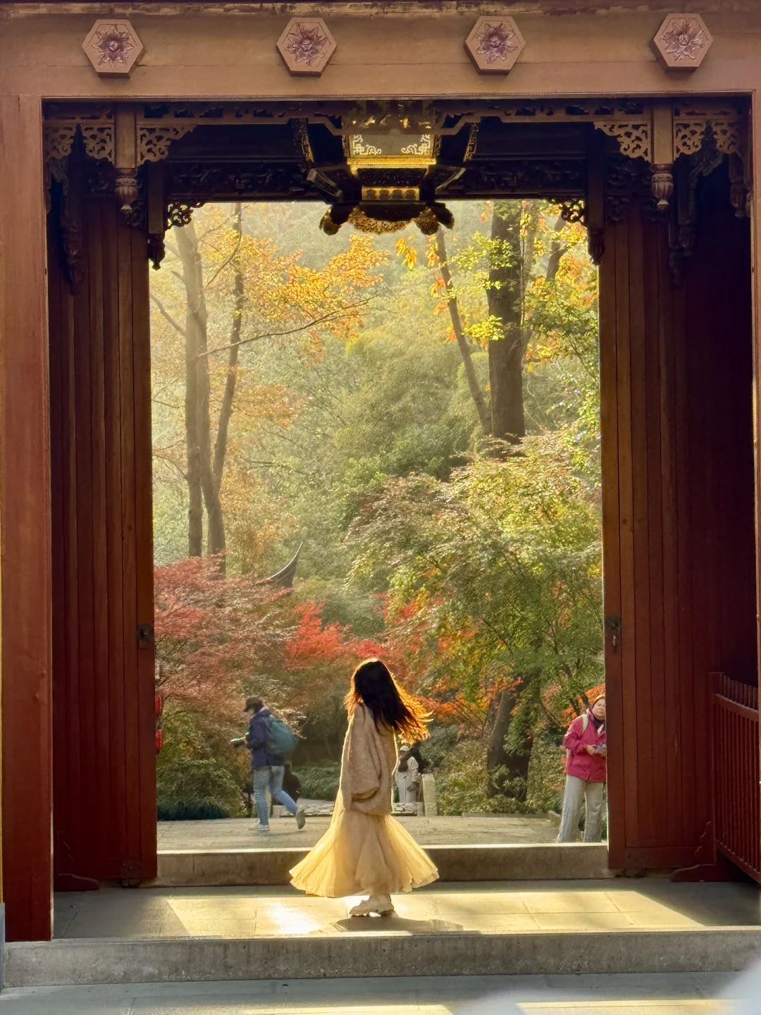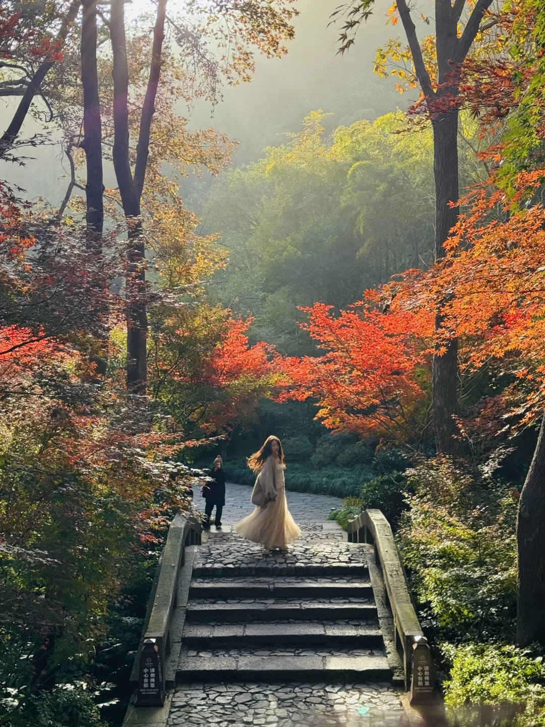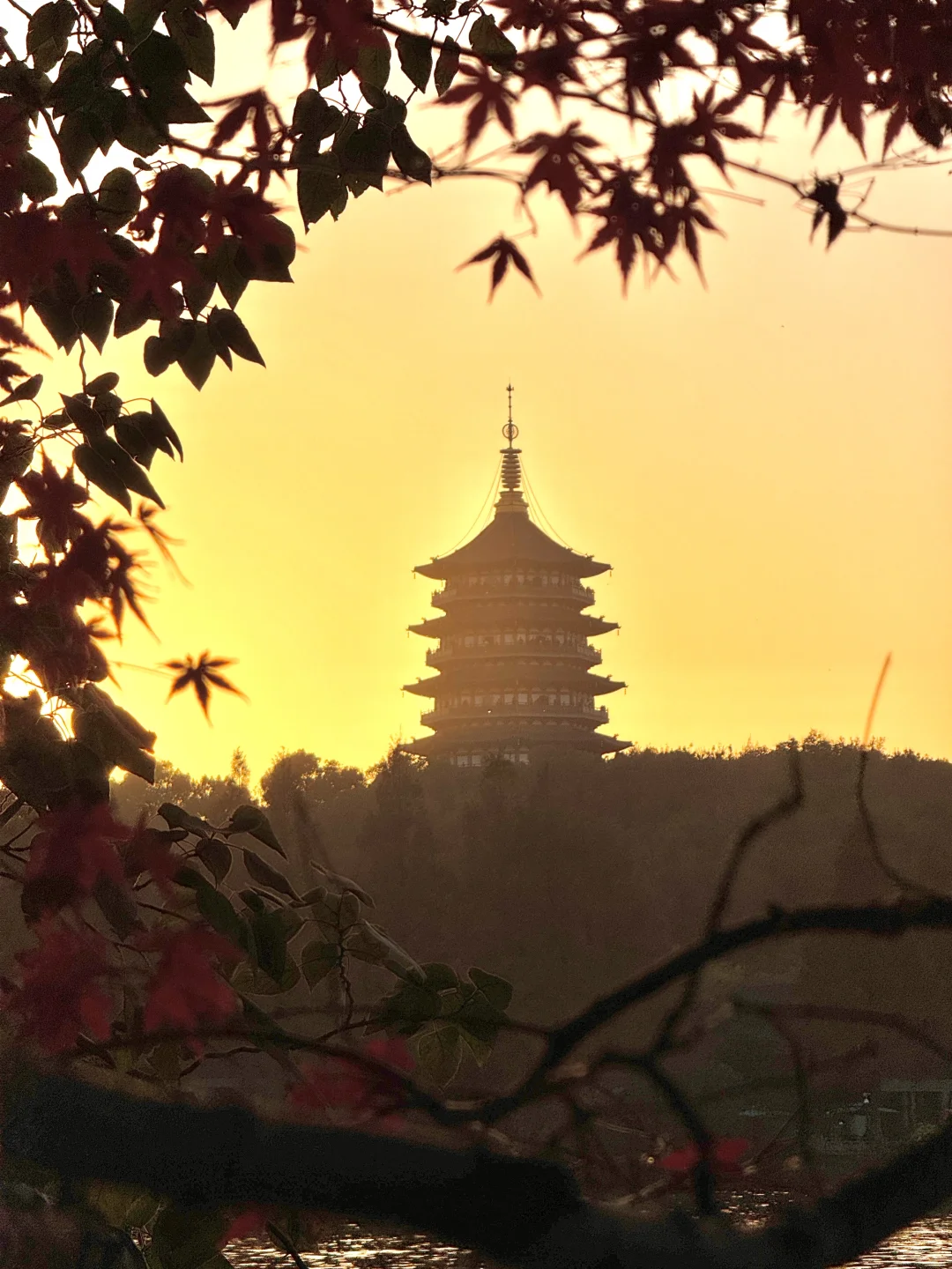 永福寺(7:55左右树叶开始被光打亮)👉茶叶博物馆👉曲苑风荷👉郭庄👉太子湾👉花港观鱼(15:00左右枫叶有光)👉长桥公园(16:50左右太阳落下山后不会因为逆光导致红枫太黑)