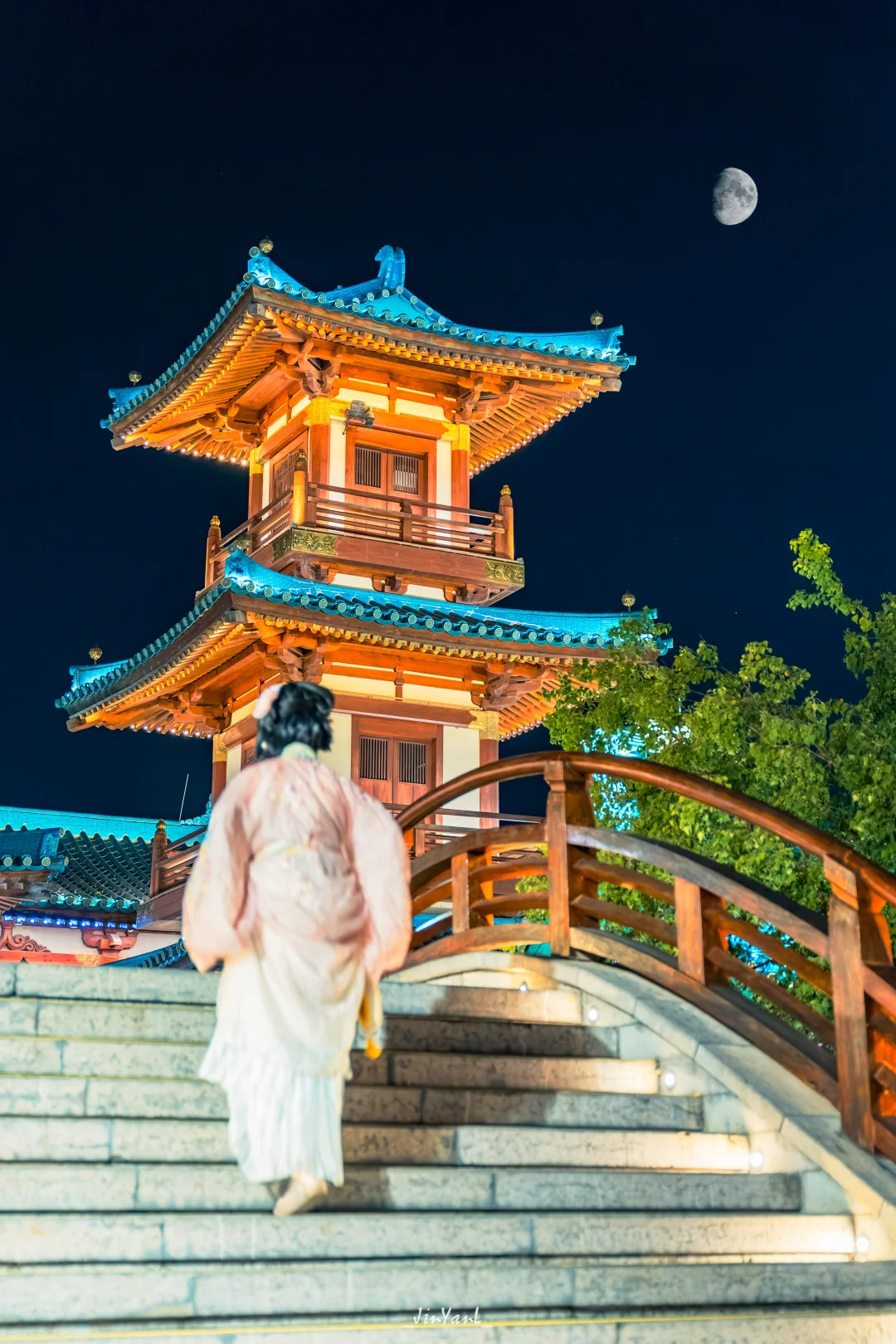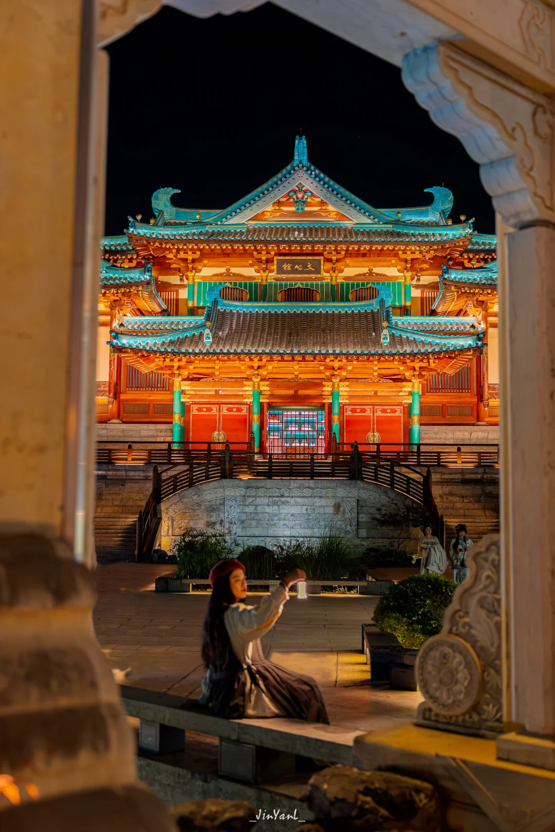 强烈安利你们把牛首山附近的金陵小城作为夜游的终点站!这里的唐风建筑亮灯后特别梦幻,绝对是穿汉服拍照的最佳时机,能轻松拍出穿越感的大片。