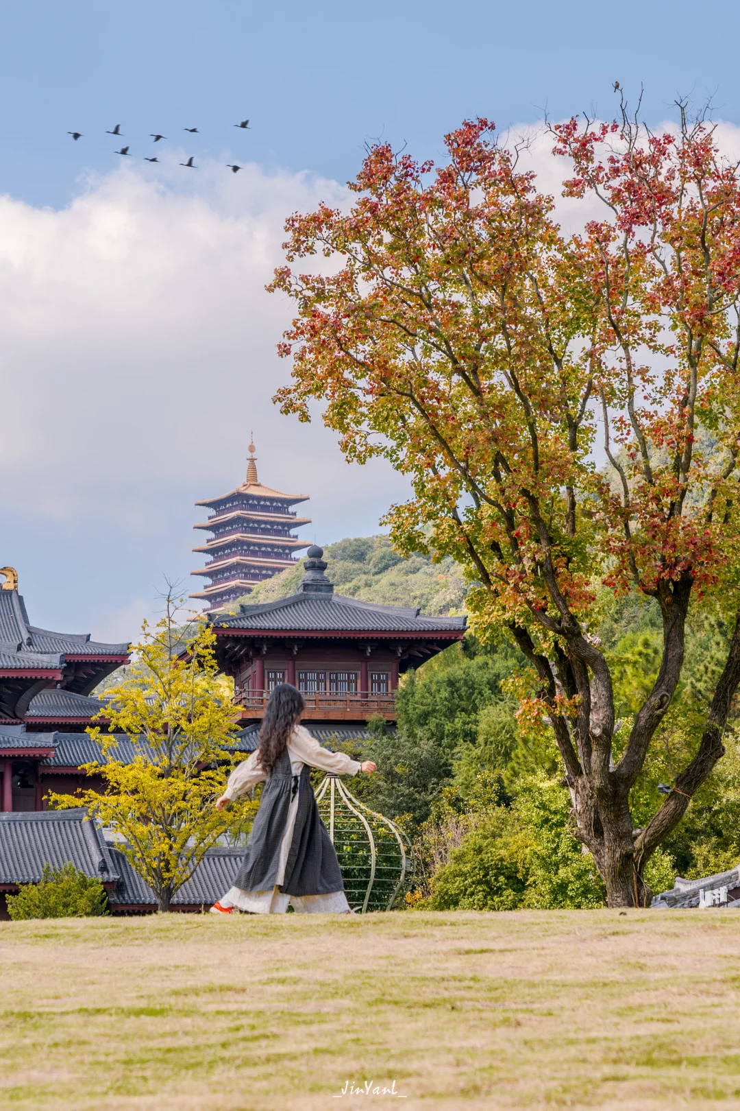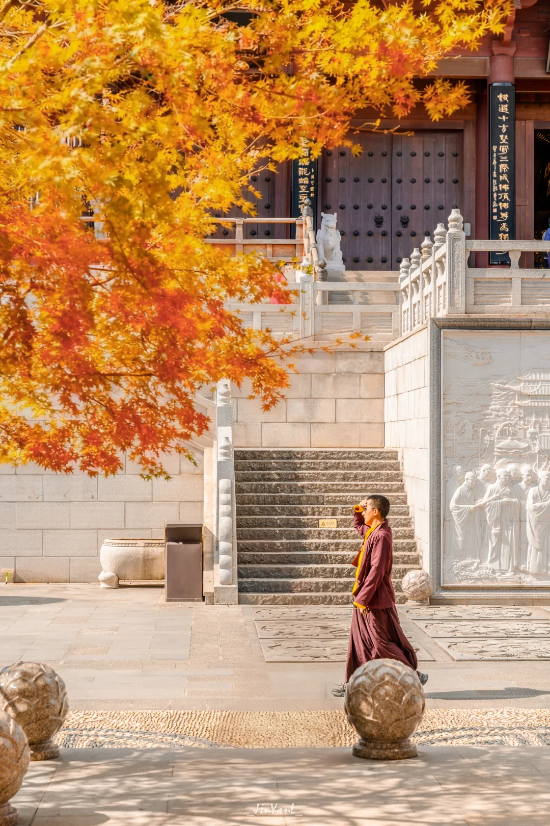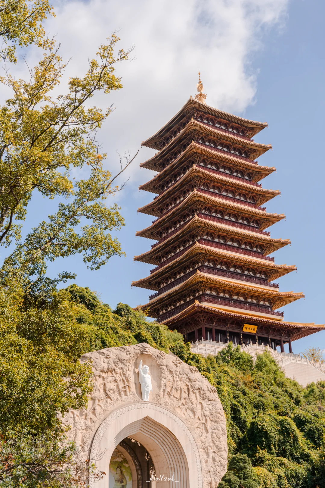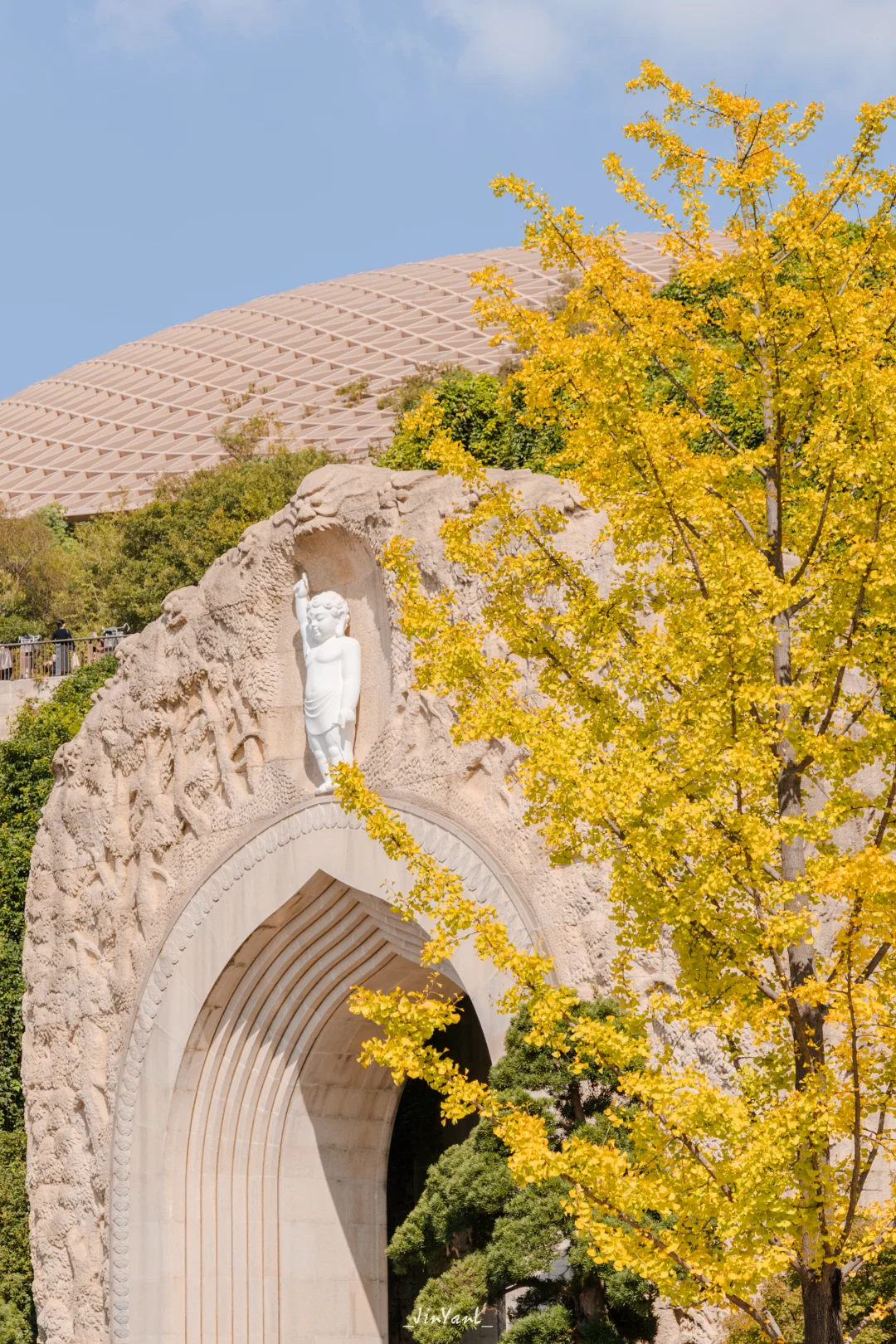 说真的,一走进景区我就被惊艳到了:金灿灿的银杏、红艳艳的枫叶、还有那片超梦幻的粉黛乱子草,把整座山点缀得跟油画一样。z让我惊喜的是,这里的秋色跟禅意建筑搭配得恰到好处——佛顶宫在秋日环抱中显得格外宁静,佛顶塔在秋日蓝天下特别庄严,随便找个角度拍出来都是大片[自拍R]