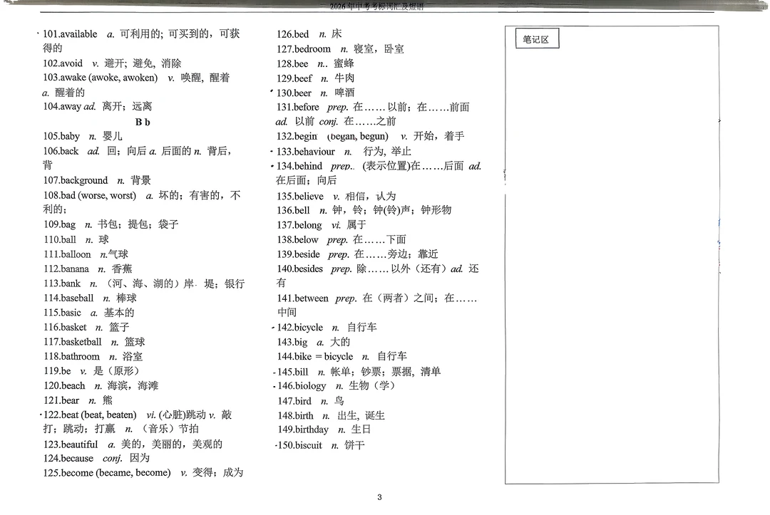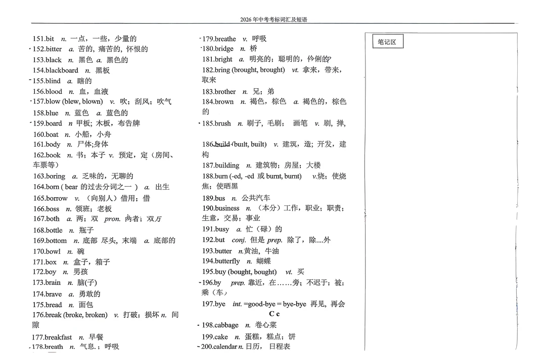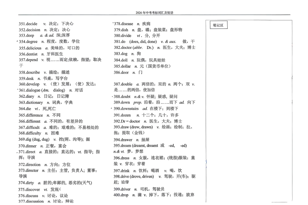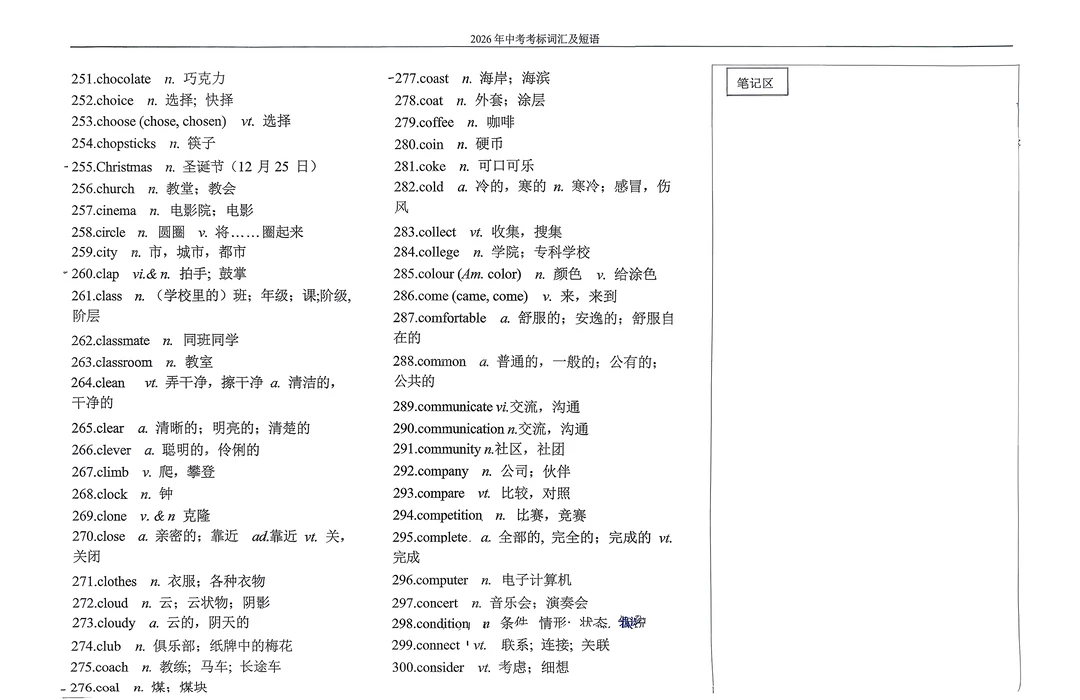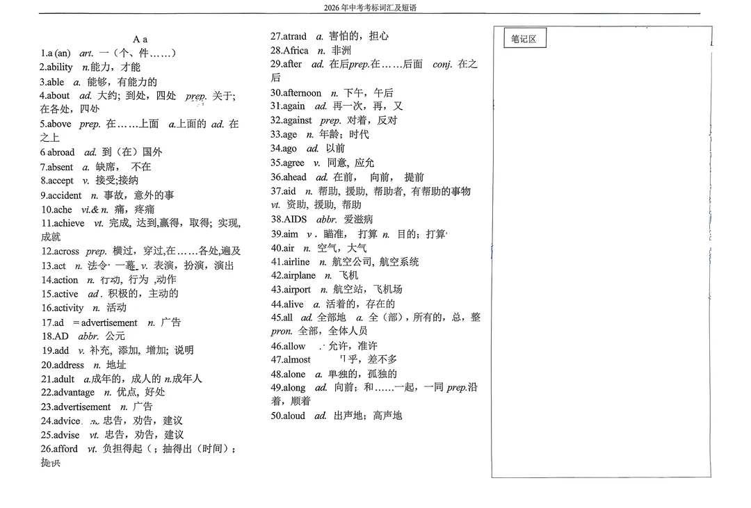 2026年英语中考考标词汇及短语