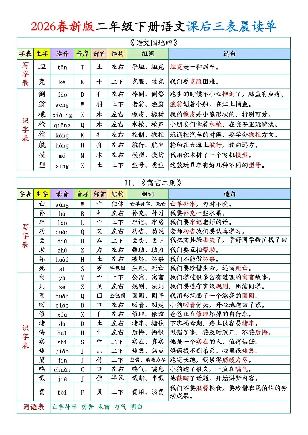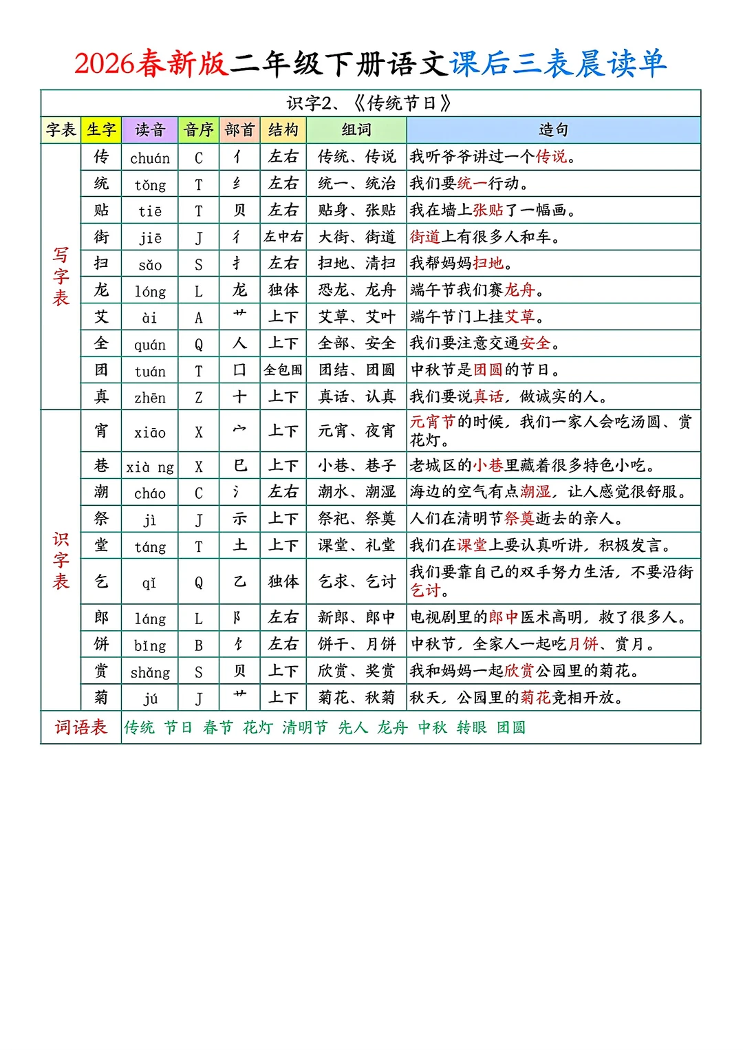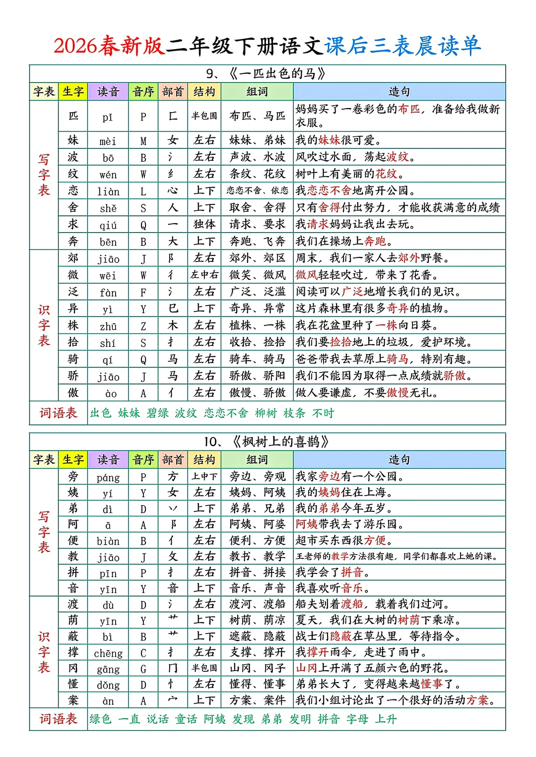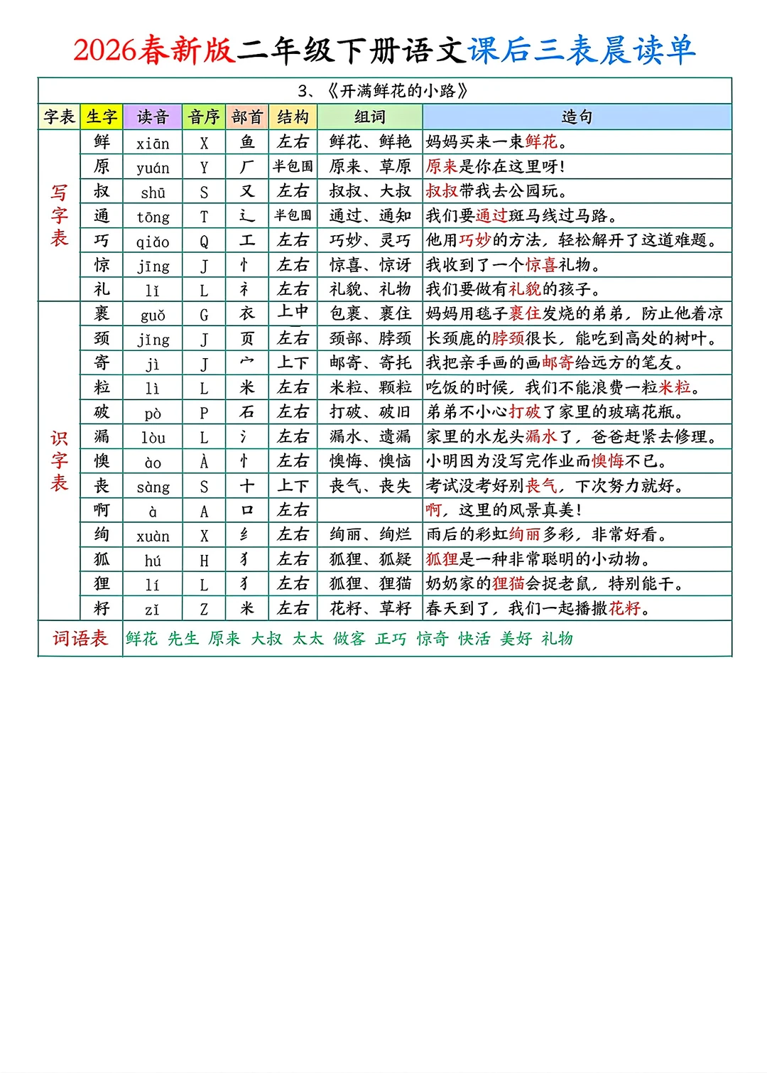 二年级下册语文课后单