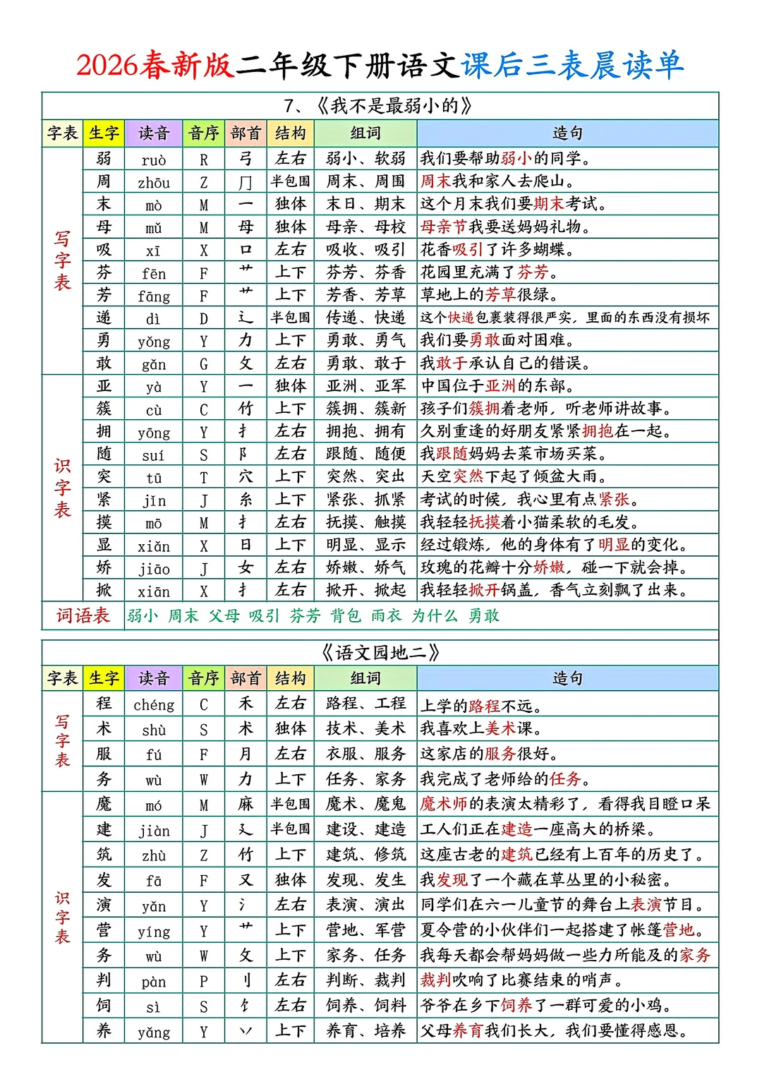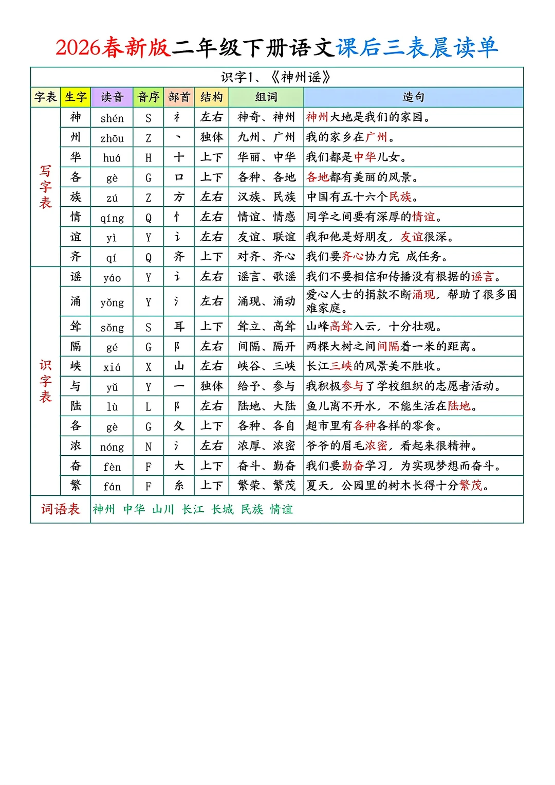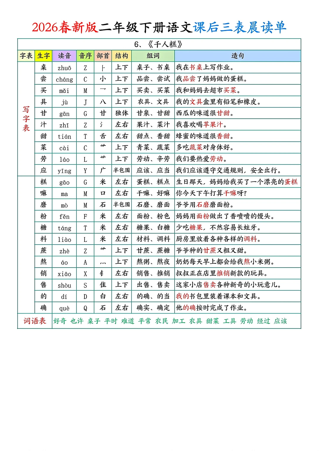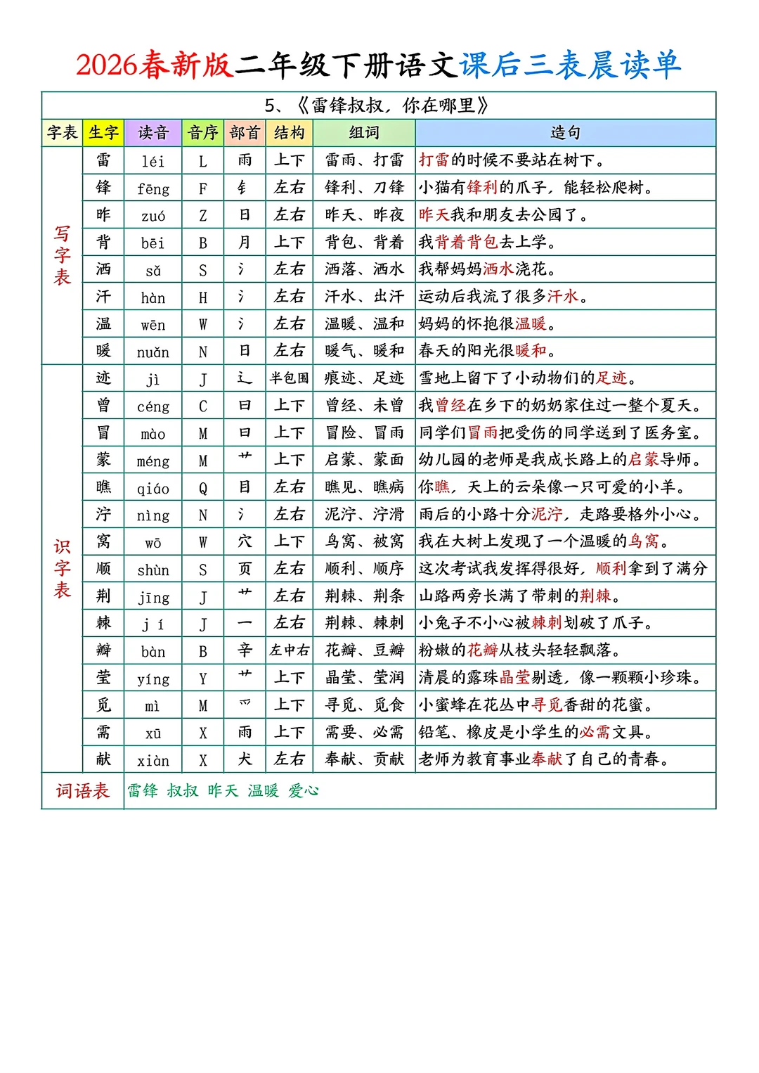 二年级下册语文课后单