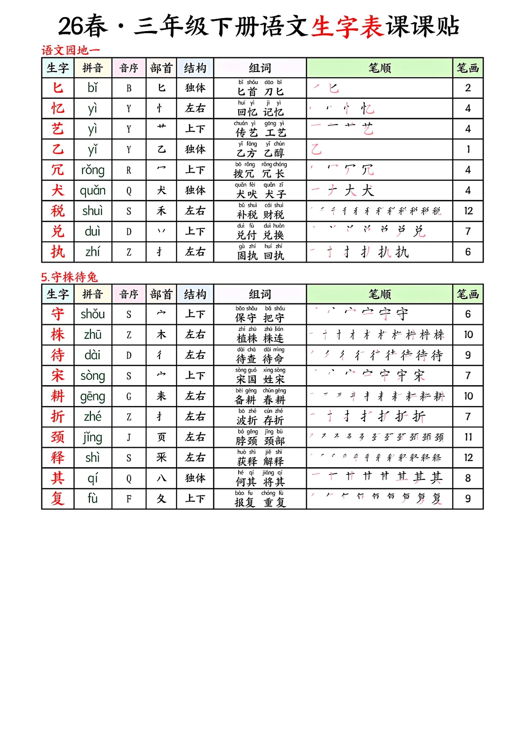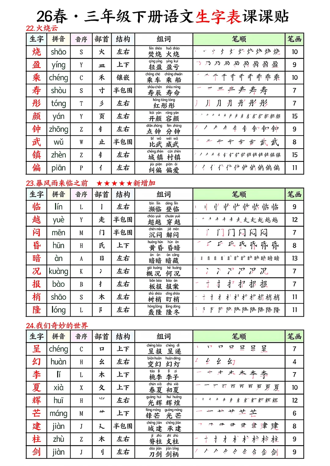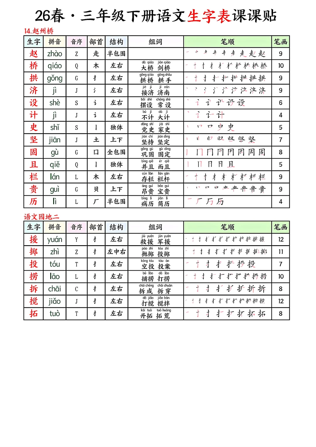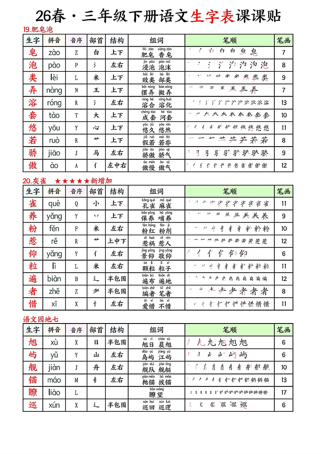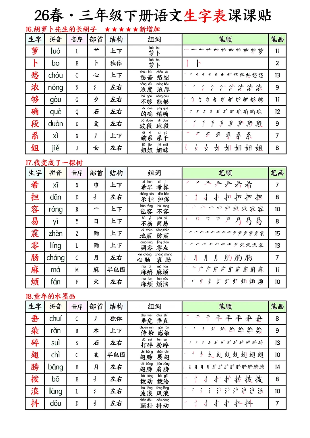 三年级下册语文生字表课课贴