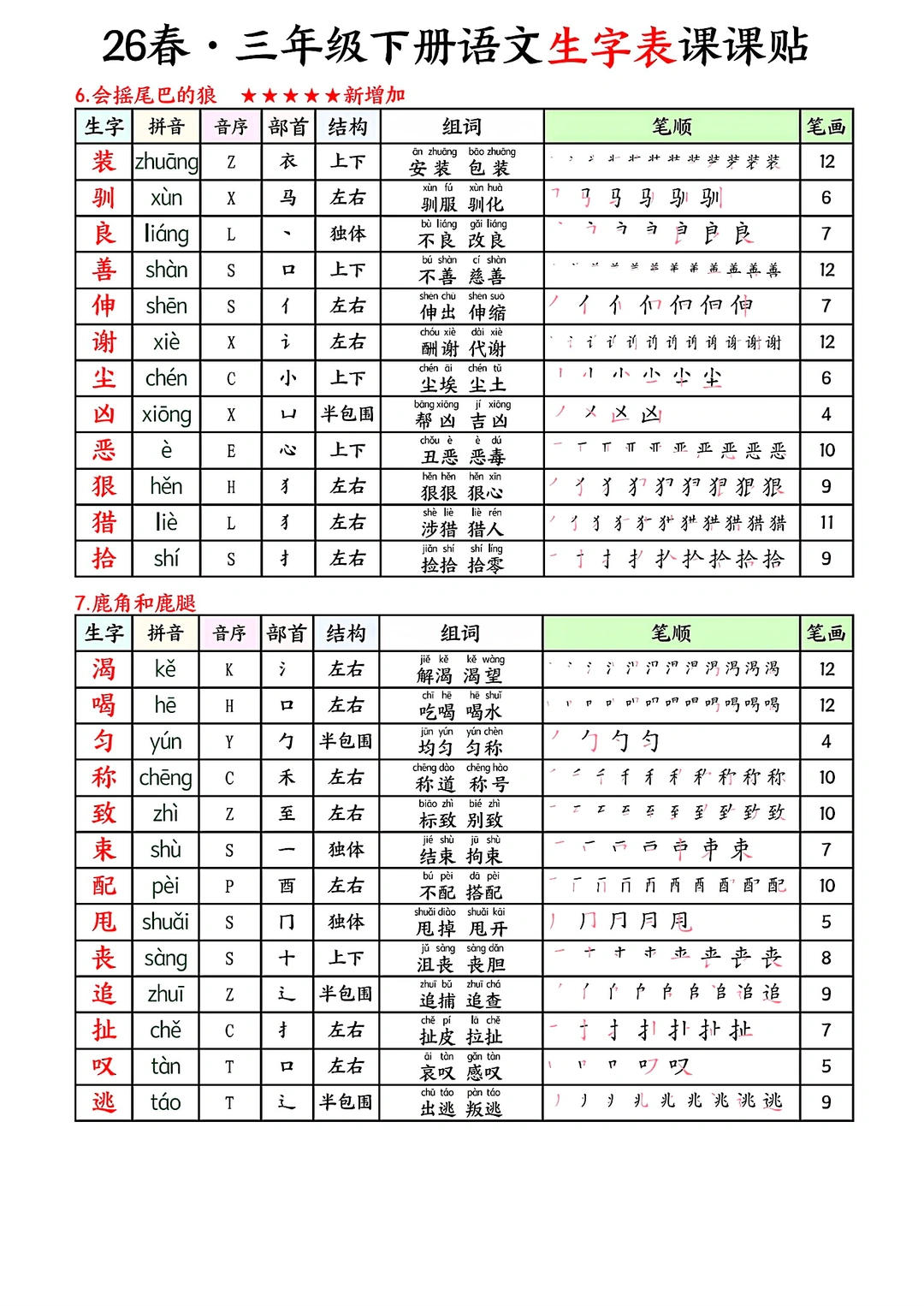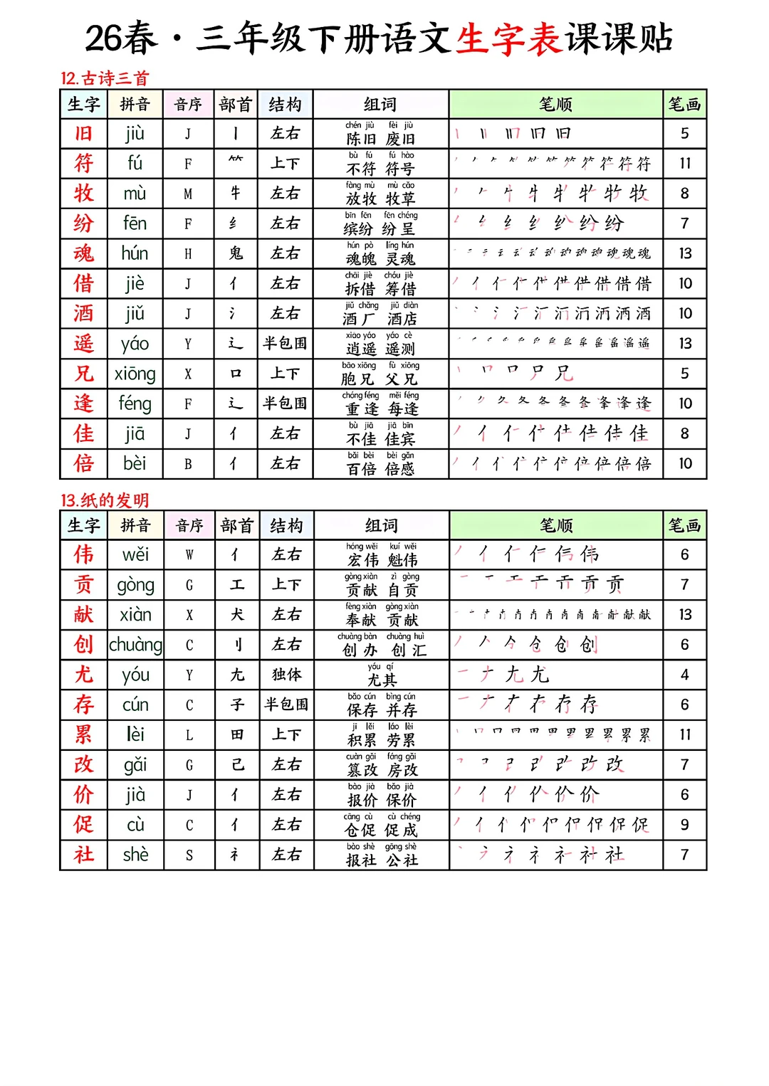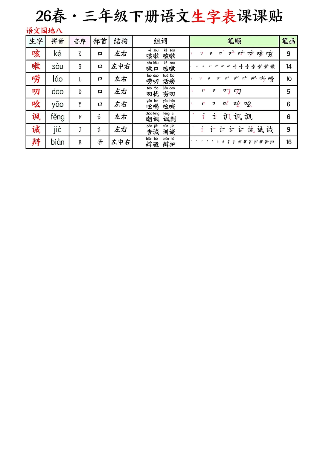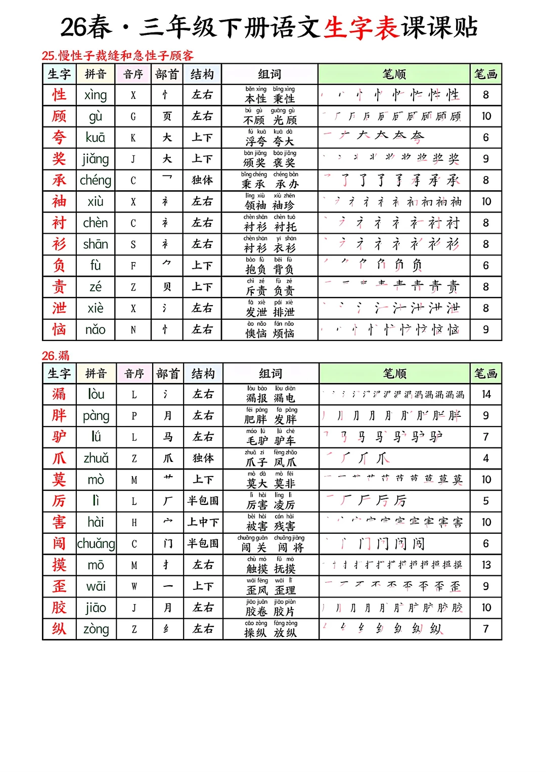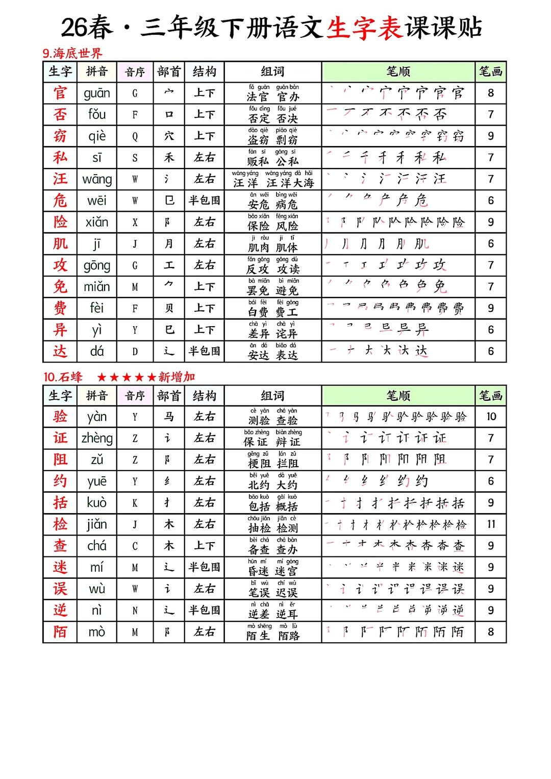 三年级下册语文生字表课课贴