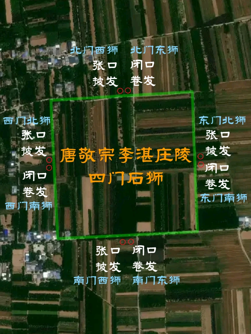 庄陵西侧石狮与北侧石狮均为开口披发,而东侧石狮与南侧石狮则为闭口卷发。