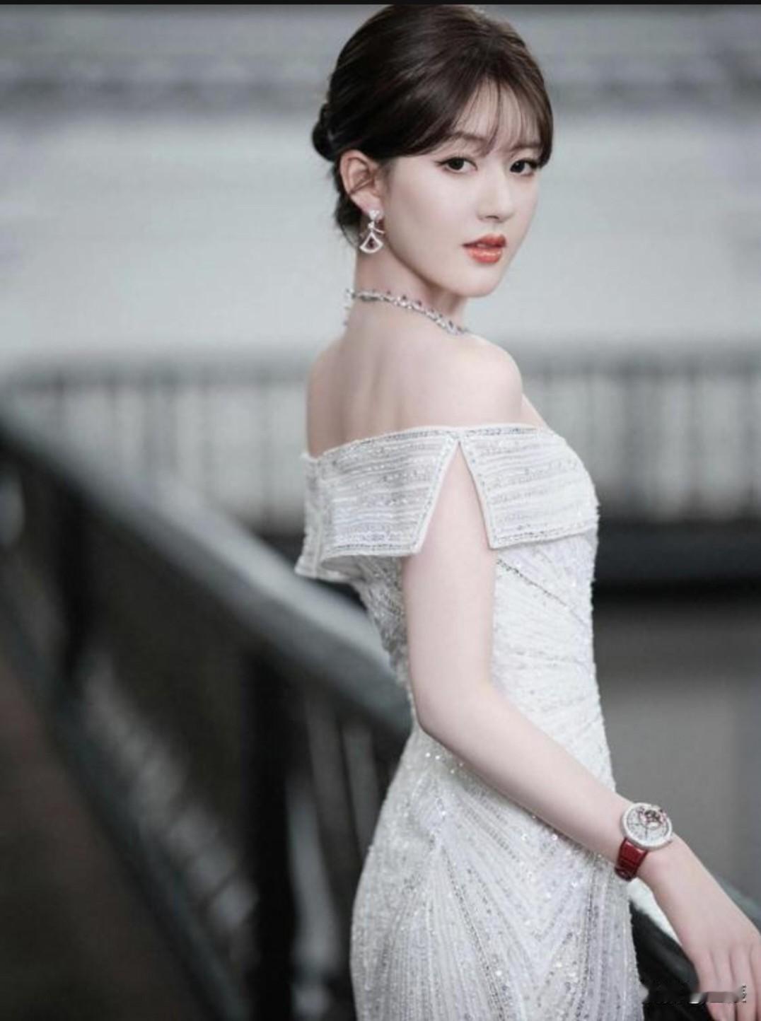 白裙衬得她皮肤像打了柔光,露肩设计露出纤细肩颈,搭配红宝项链,贵气中带着柔媚。耳坠光泽与红唇相衬,恰到好处。她头发松松挽着,碎发落在鬓角,尽显“松弛的精致感”。手腕上红表带的表与项链宝石颜色呼应,细节满满又不刻意。