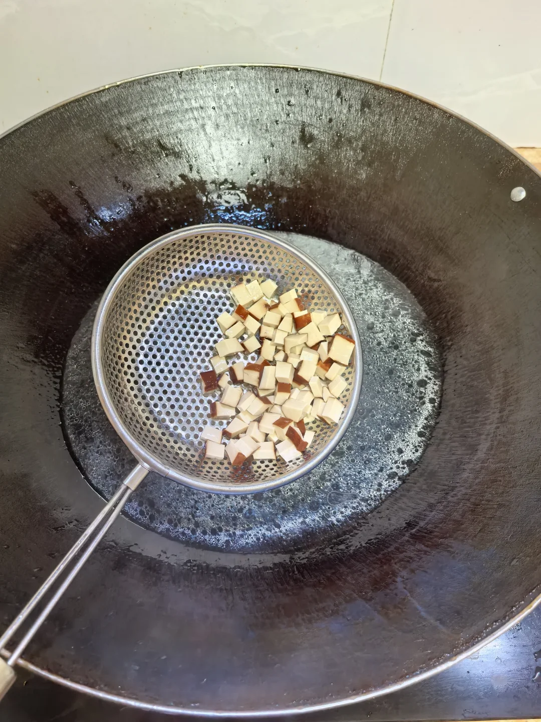 把豆干切碎,水开后加入少许盐、油,把豆干放入开水里焯烫2分钟捞出控干水份。