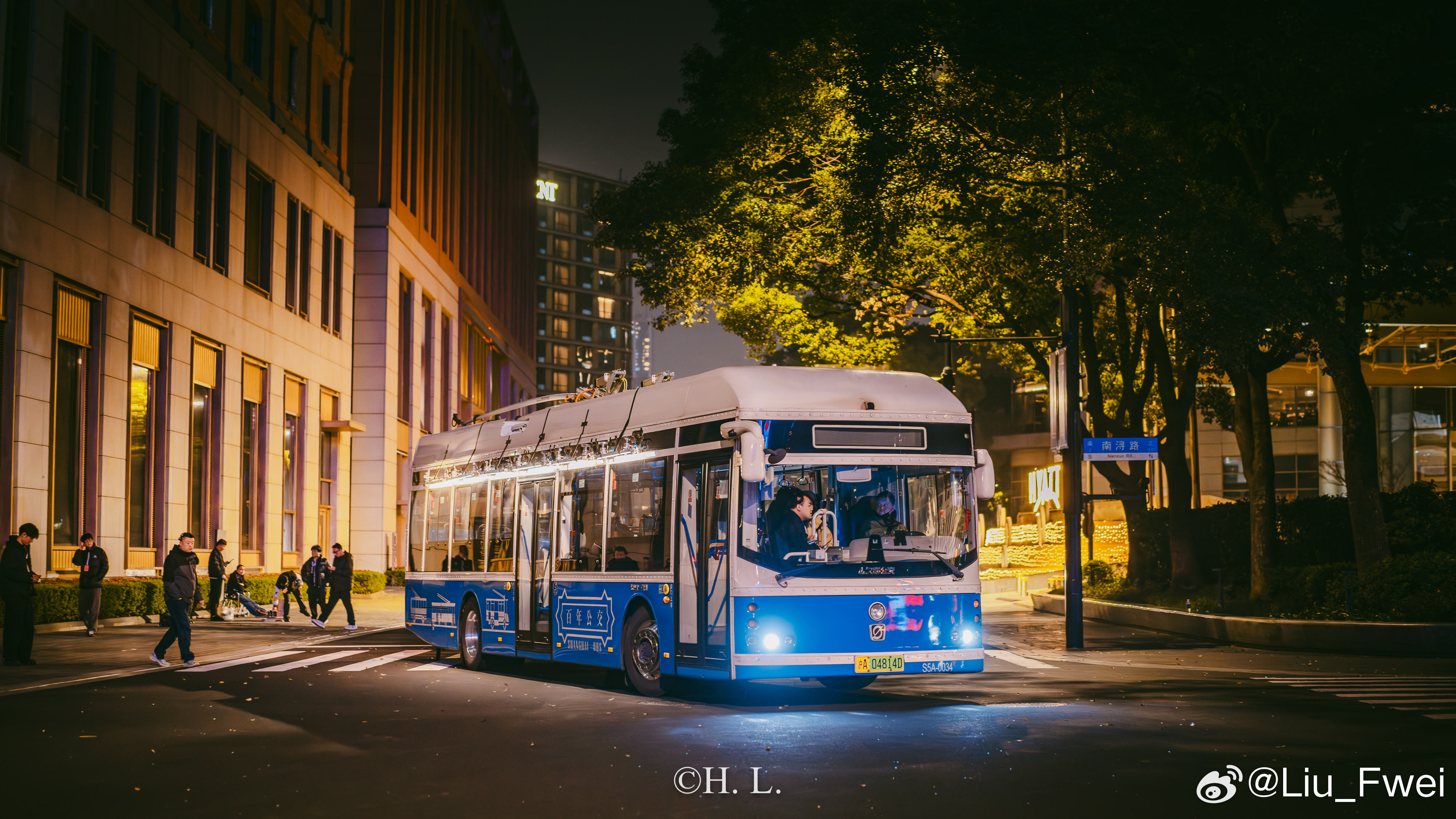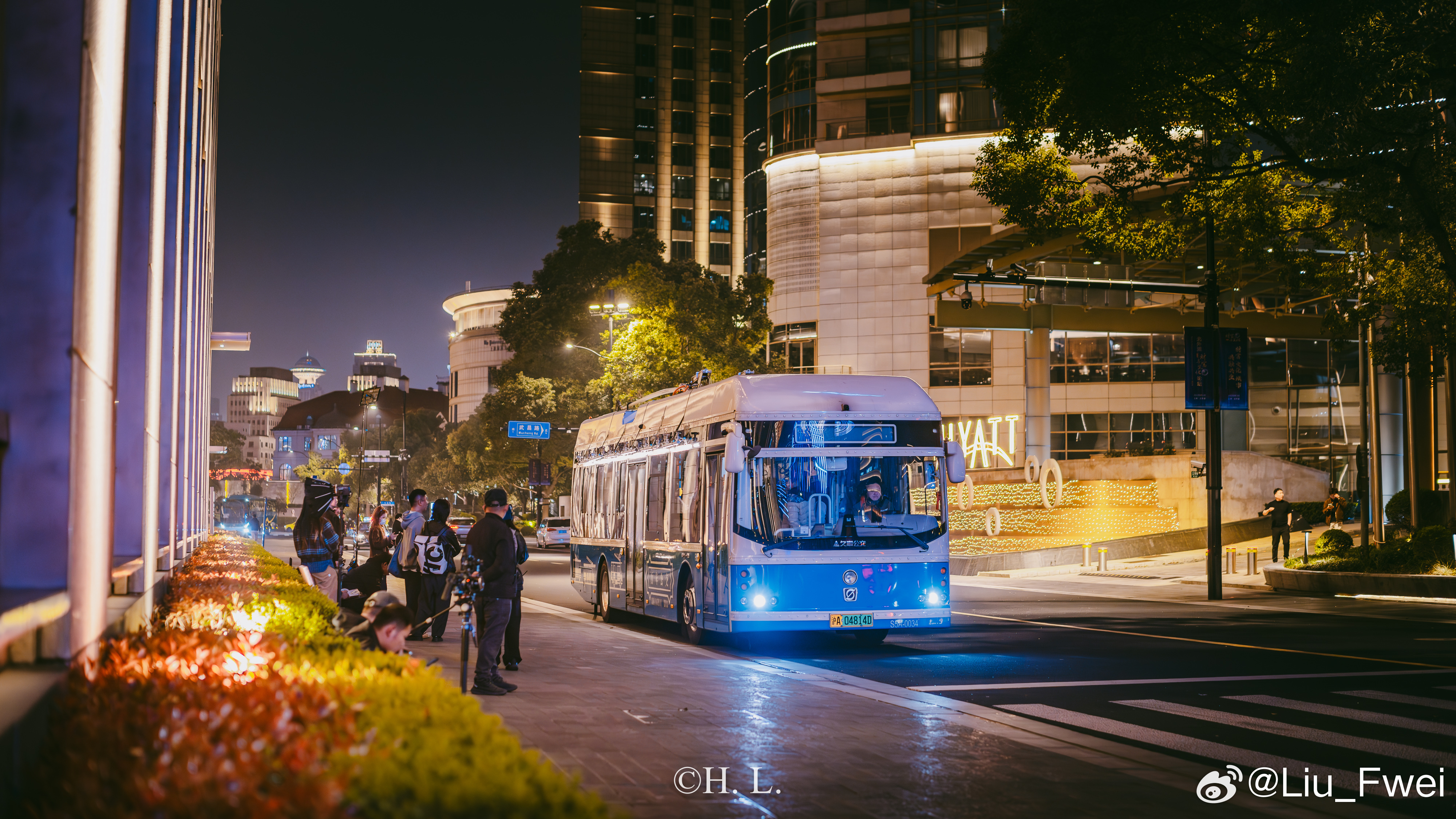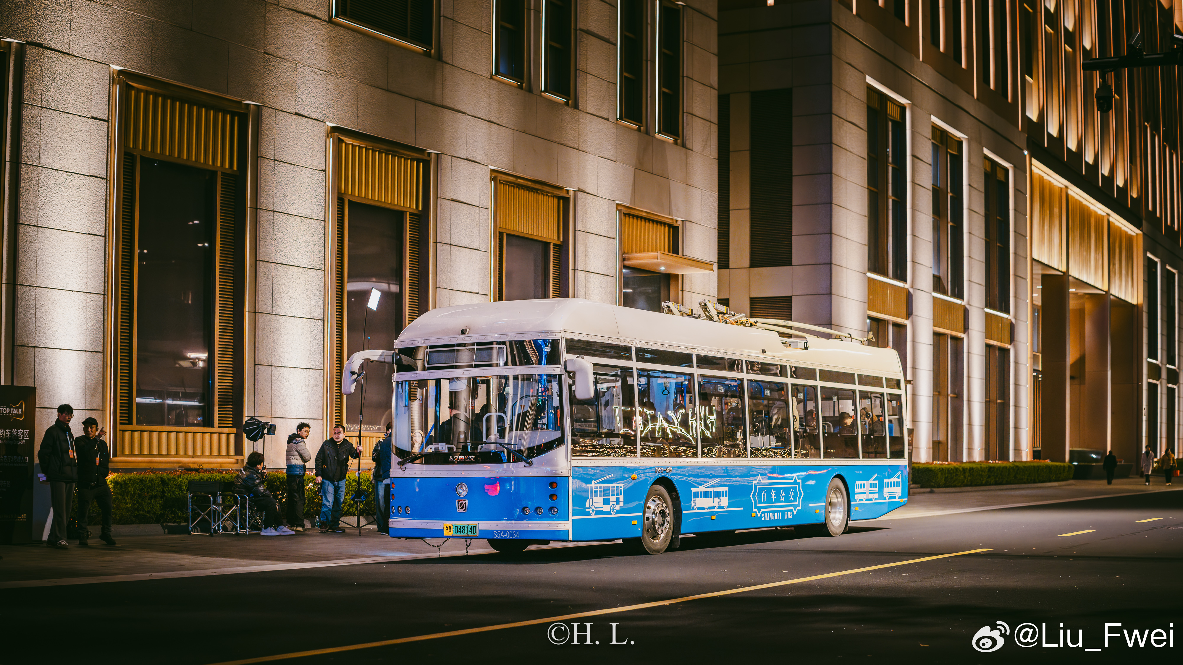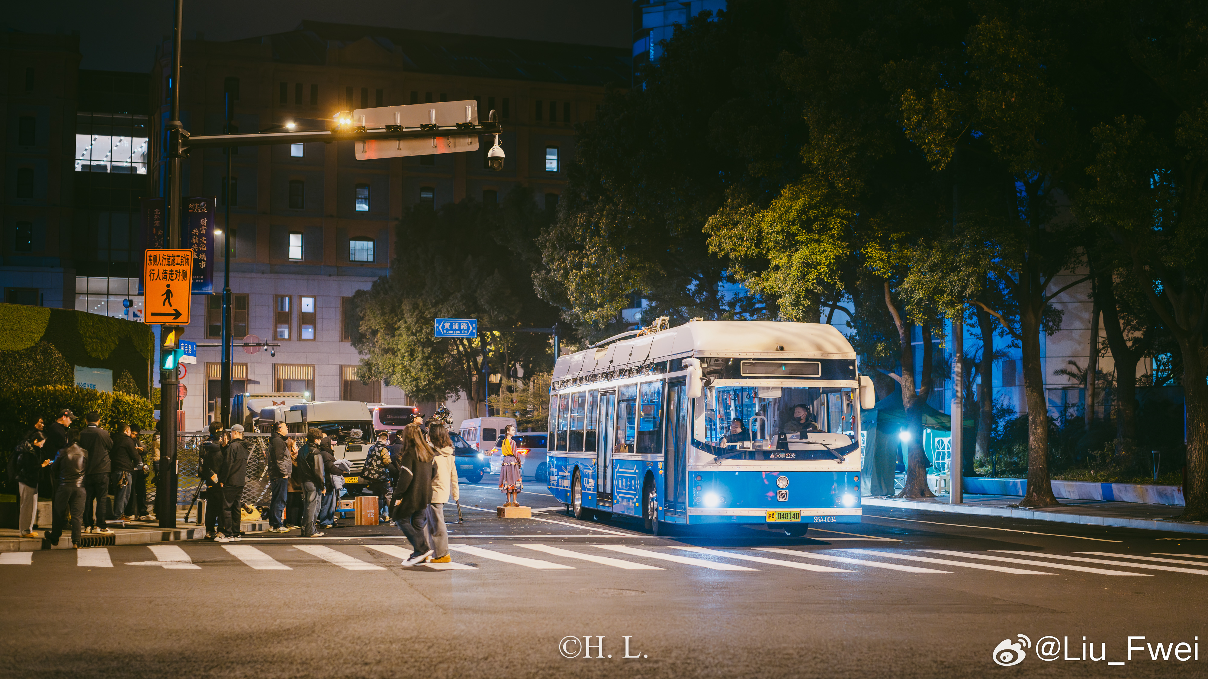 无轨电车参与拍摄。3月25日夜晚,北外滩-外滩部分路段。