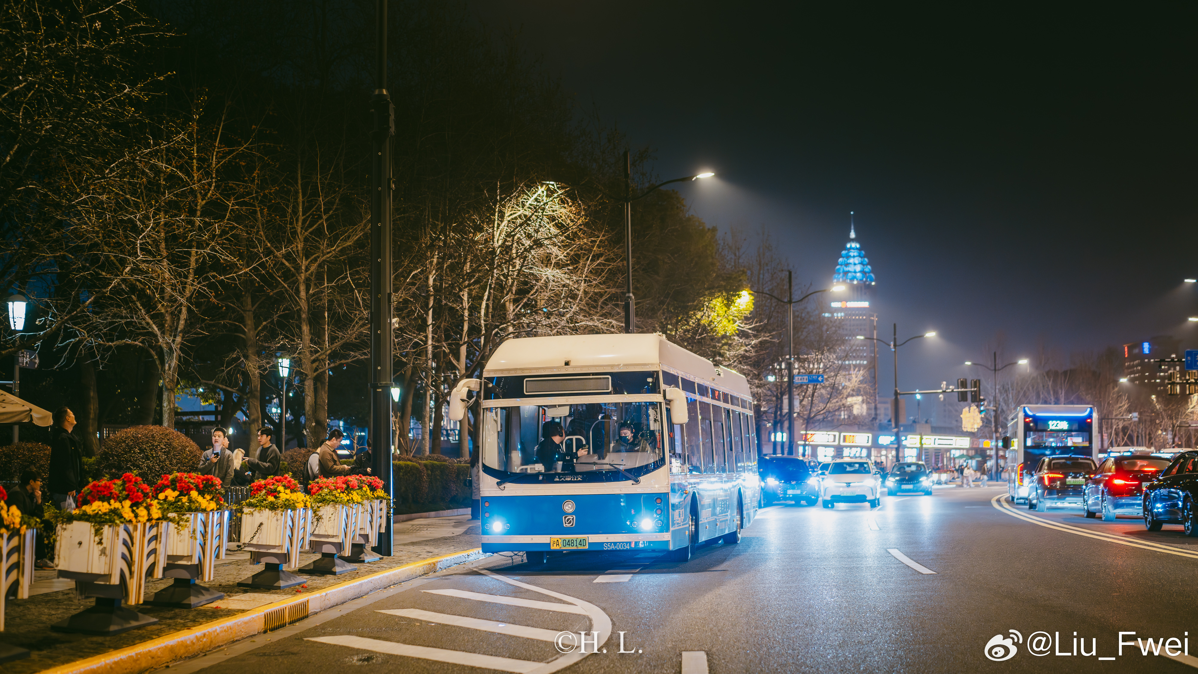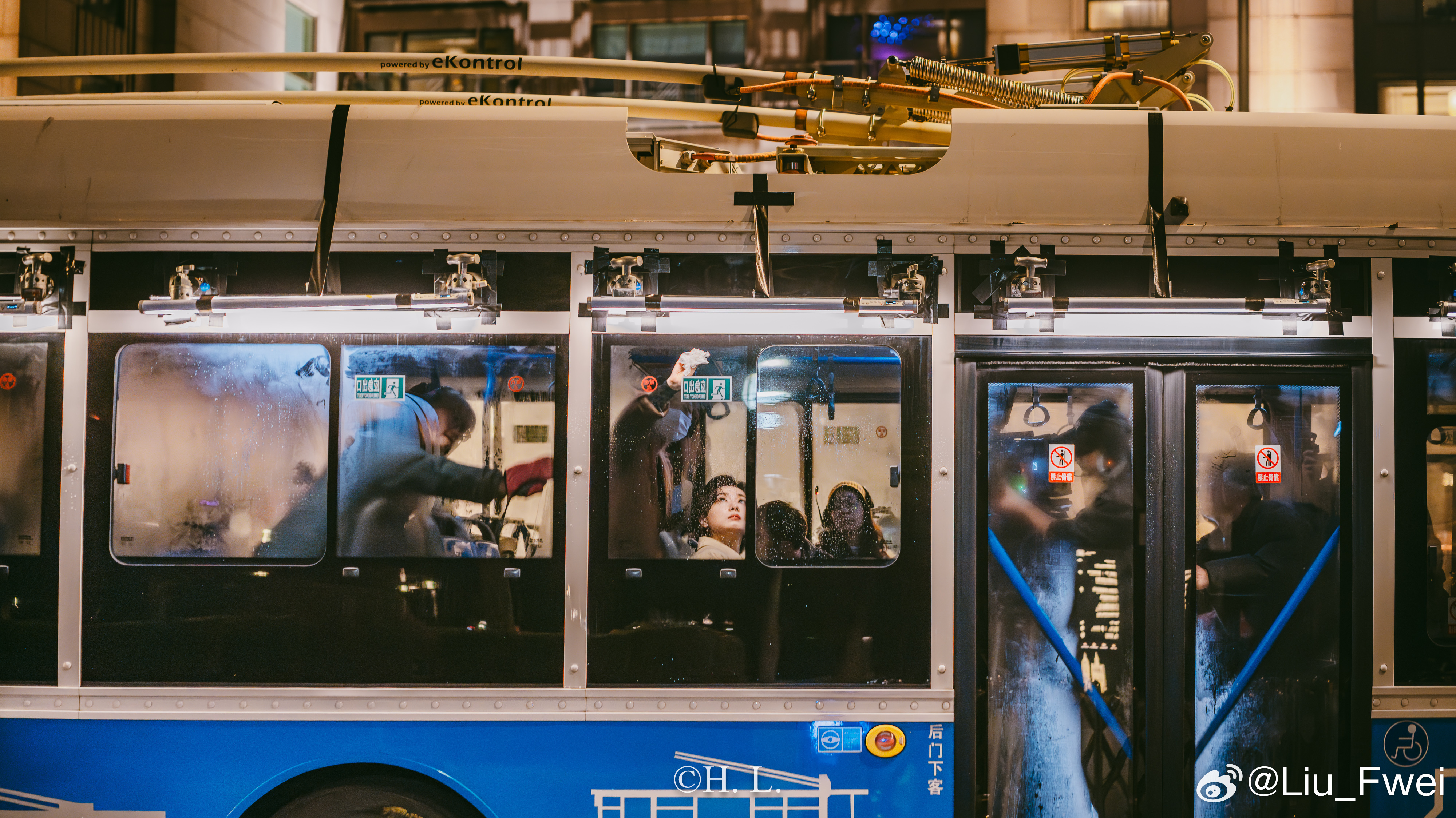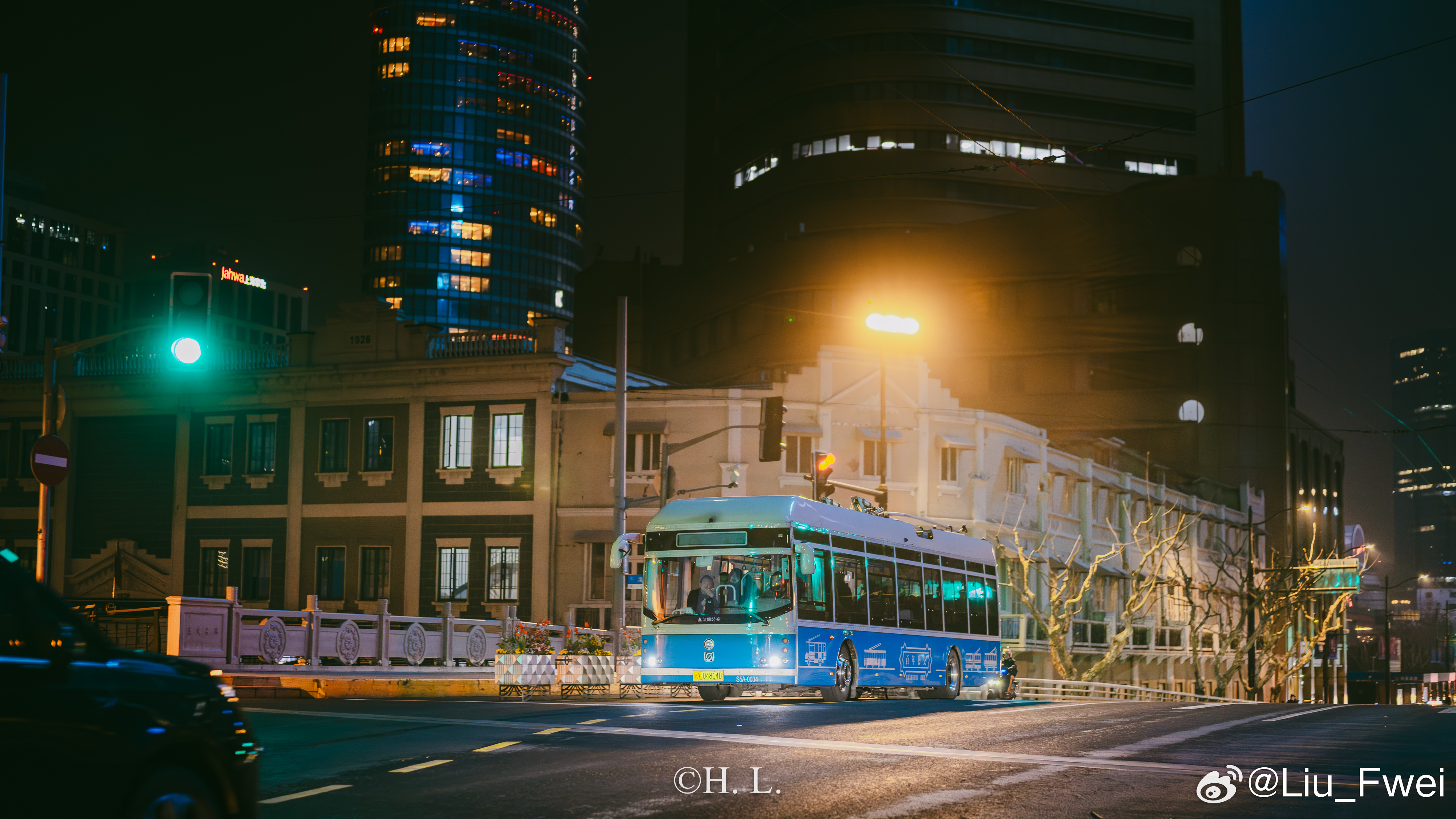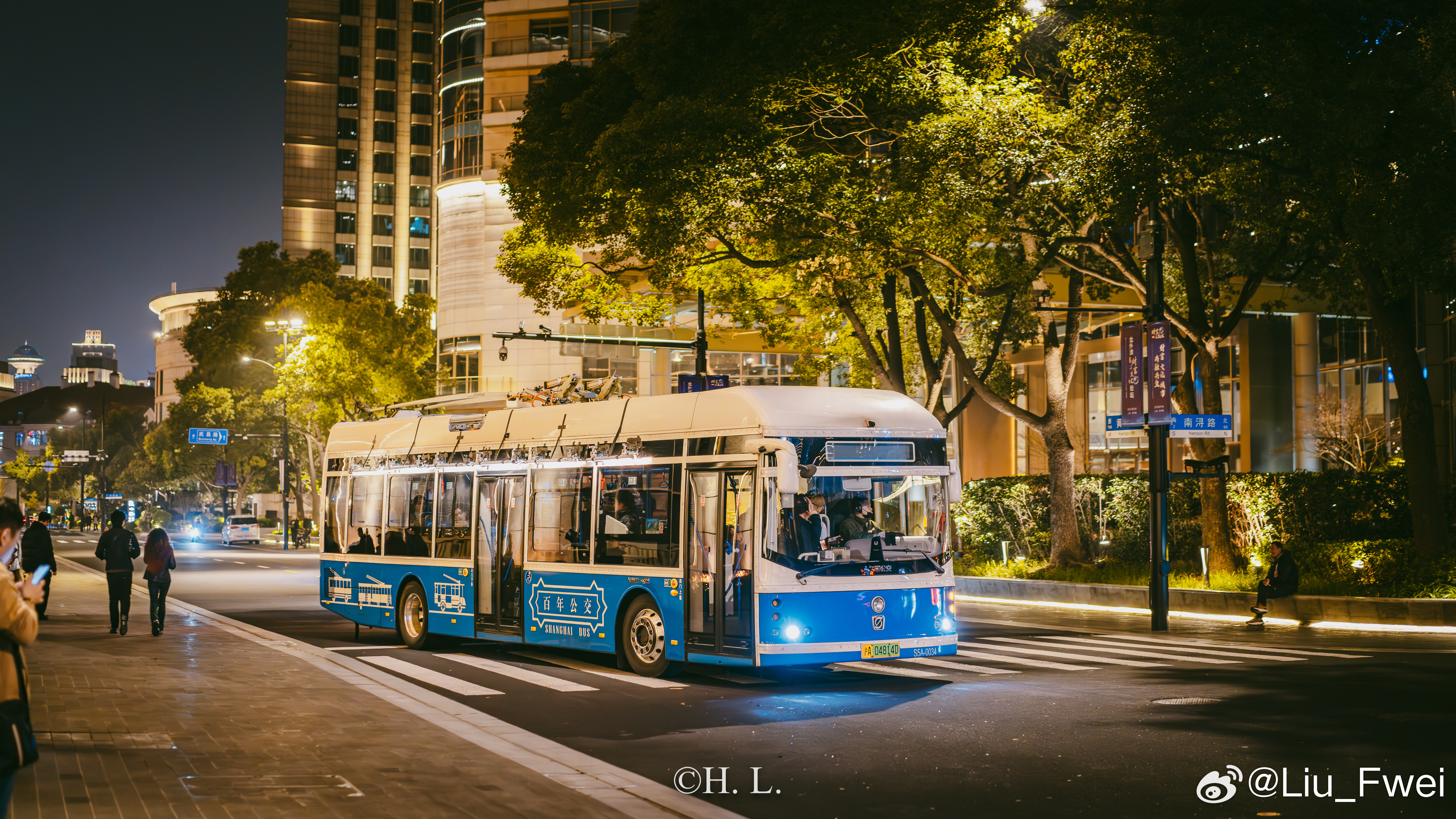 无轨电车参与拍摄。3月25日夜晚,北外滩-外滩部分路段。