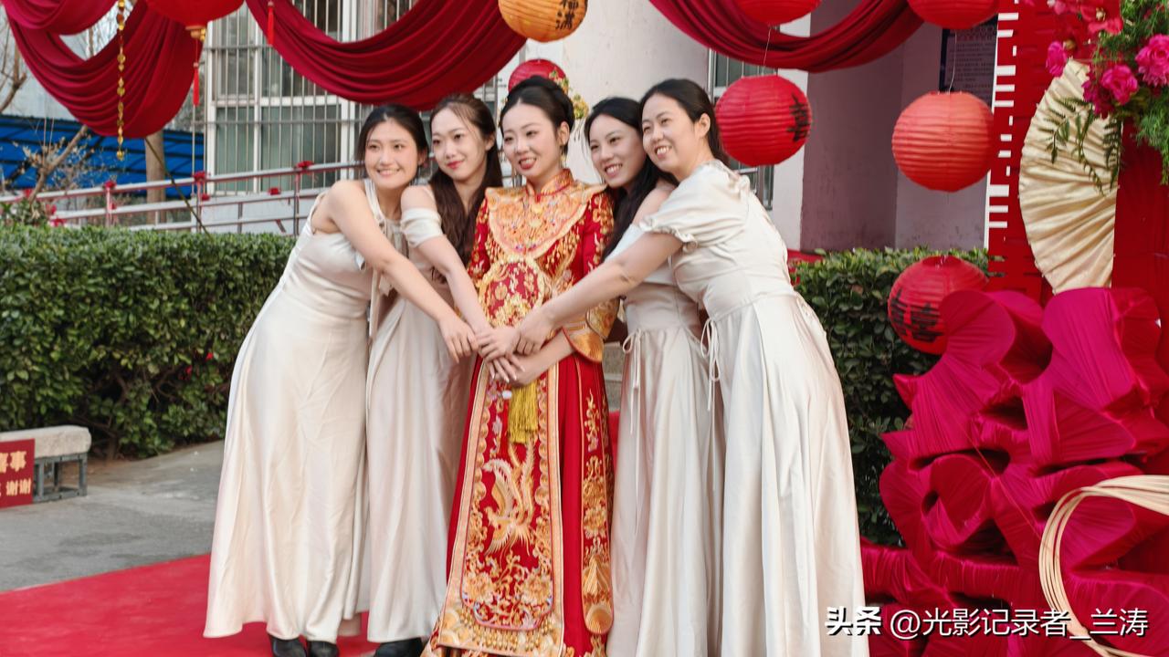 新娘身姿袅袅,一袭红色嫁衣似火般明艳,衬得她肌肤胜雪,眉眼含情,美得动人心魄。身旁的伴娘也个个花容月貌,青春靓丽。可在这喜庆的氛围里,新娘那独有的幸福光芒与绝美风姿,还是让她在众人中脱颖而出。