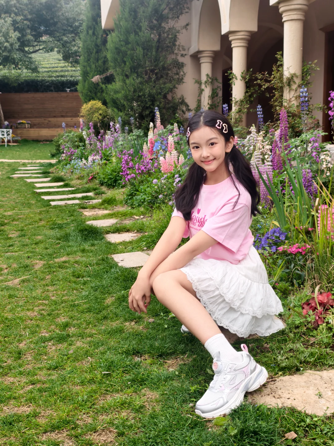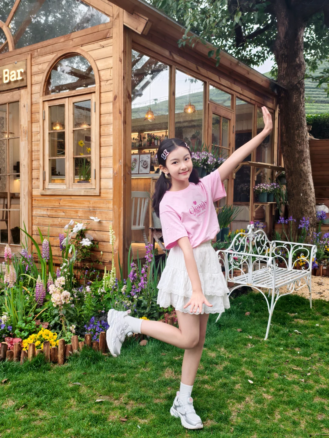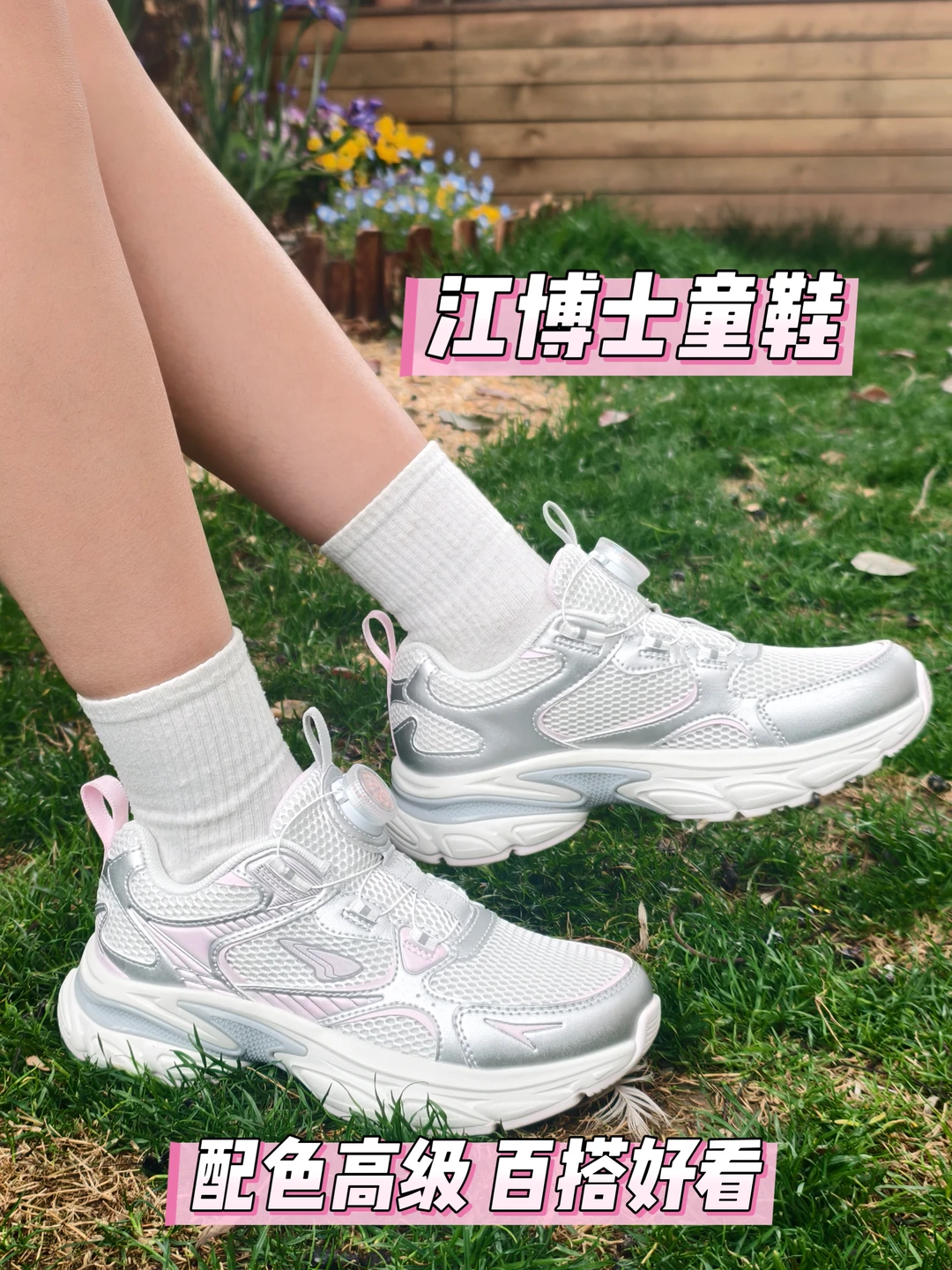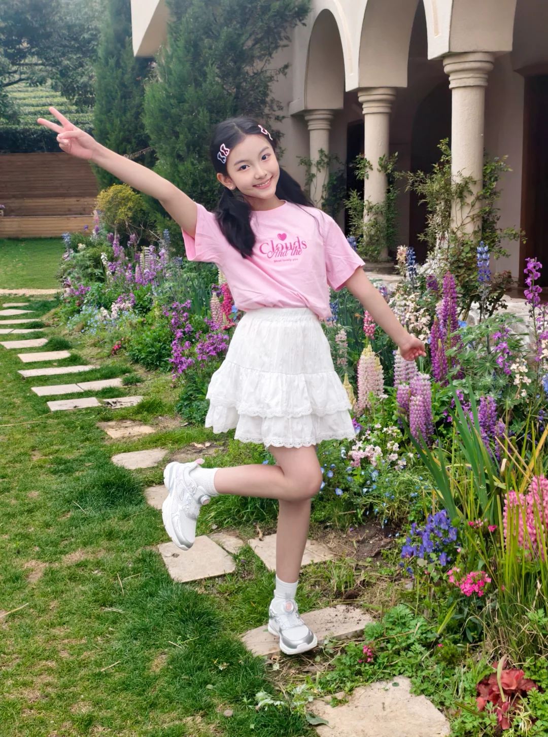 银粉色的鞋子和裙装适配度拉满,在花园里和鲜花合影,氛围感直接拉满,随手拍都很出片。