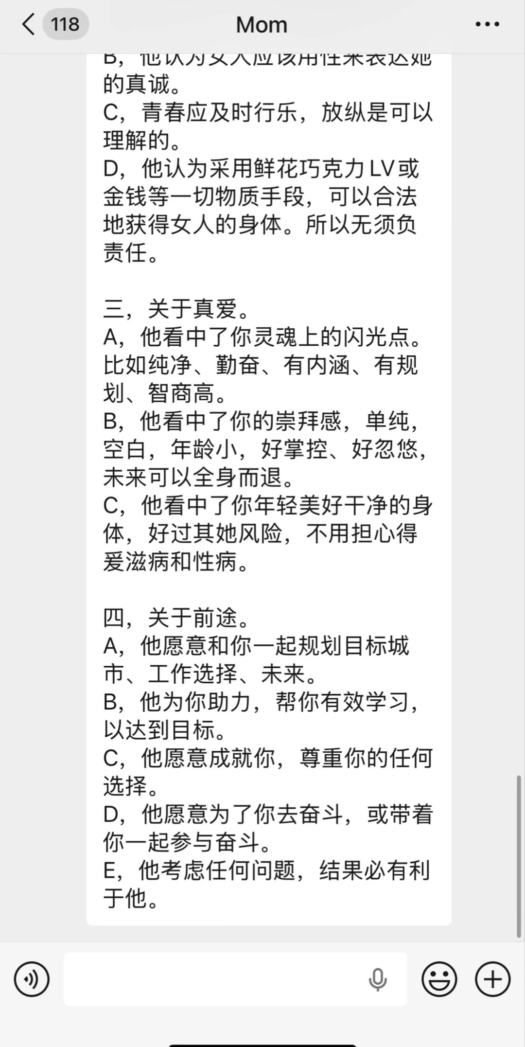他们对家庭定位永远模糊不清,总把“比上不足比下有余”挂在嘴边,活在自己的完美滤镜内。在妈妈的认知里婚前性行为是不可饶恕的罪孽,把“没有恋爱经验”当成女儿最值钱的筹码——说好听点是“自重自爱”,剥开来看,不过是把我当成一件待价而沽的商品,用“纯洁”去抬高身价。更让我寒心的是,他们甚至直白地说,当年花几百万送我去海外留学,是为了给我在相亲市场中镀一层金。把“海归硕士”的标签当成我议价的资本。