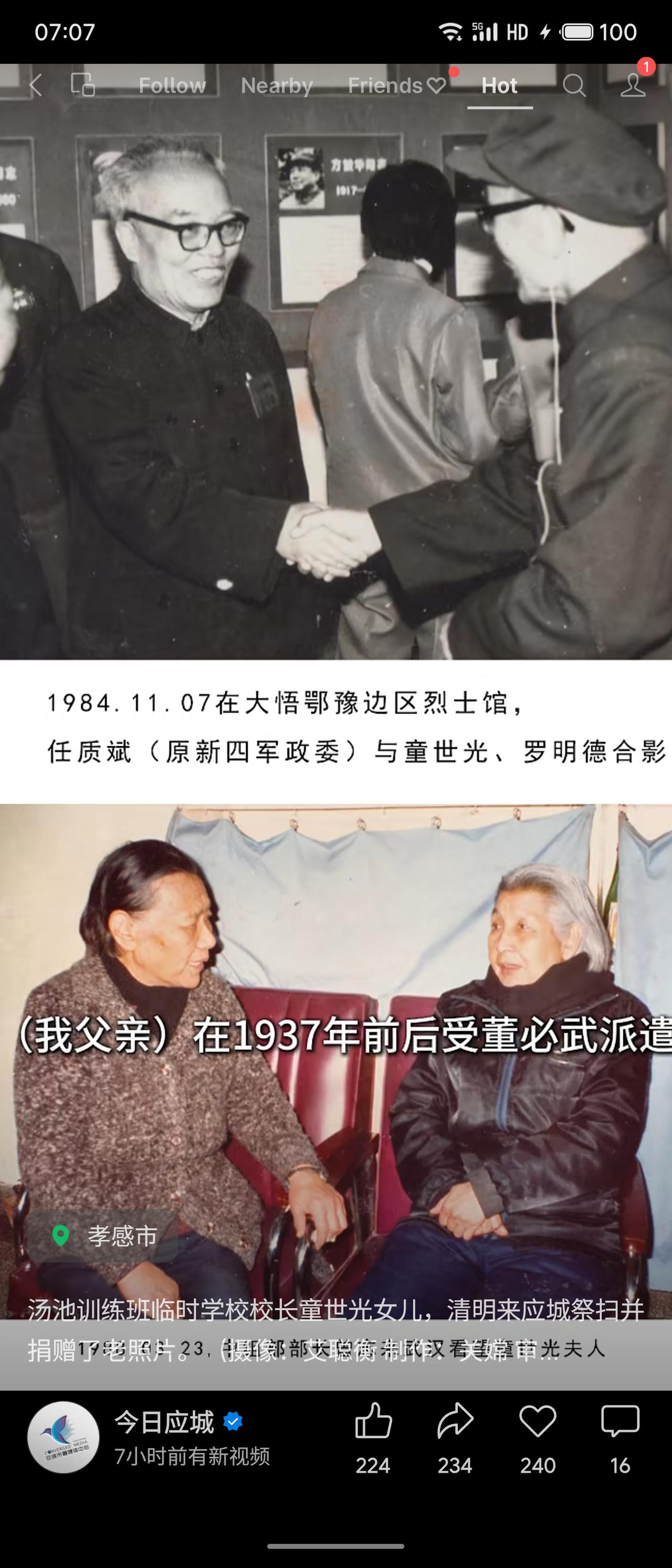 晒出你的本地生活4月1日,清明前夕,汤池训练班临时学校校长童世光的女儿——华中农业大学退休教师童晓晋,专程来到湖北应城祭扫先烈,并捐赠了一批珍贵的老照片。童世光是汉川人,1925年参加革命,曾担任董必武、陈潭秋的秘书,抗战时期任汤池临时学校校长、中共汤池特别支部书记等职。新中国成立后,他长期在湖北教育系统工作,曾任湖北省教育厅厅长、华中农学院党委书记等职。童晓晋表示,要将革命精神代代传承下去。现场还展示了1984年任质斌(原新四军政委)与童世光、罗明德在大悟鄂豫边区烈士馆的合影。