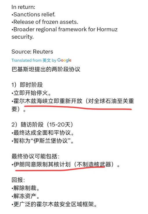 4月6日,根据外媒报道,在巴基斯坦的斡旋下,美国与伊朗进行了接触。巴基斯坦提出的两阶段协议,第一阶段,美国的条件是,停火立即开始,霍尔木兹海峡立即重新开放(全球石油的关键)。第二阶段是,未来15-20天,最终达成全面和平协议。包括:伊朗同意限制核计划(无武器)。