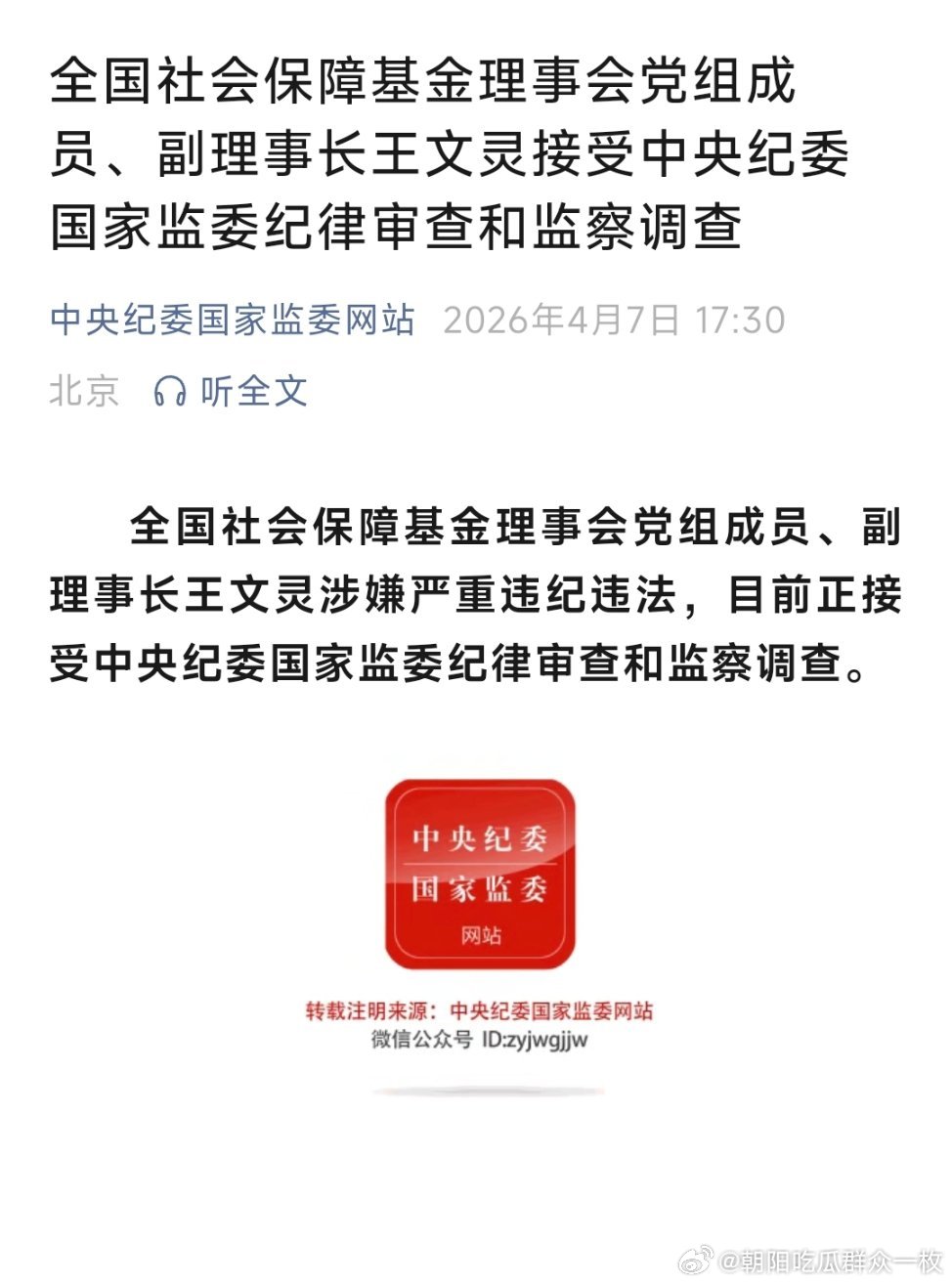 社保基金会副理事长王文灵被查全国社会保障基金理事会党组成员、副理事长王文灵接受中央纪委国家监委纪律审查和监察调查。