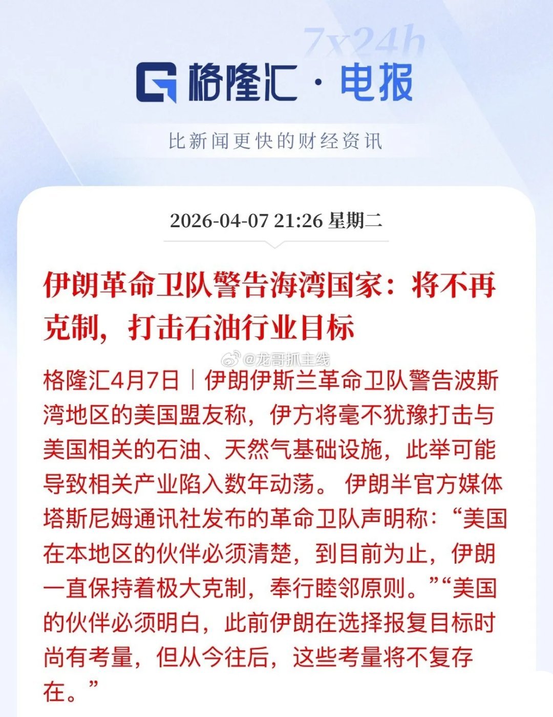特朗普威胁:今晚整个伊朗文明将会消亡!伊朗革命卫队警告海湾国家:将不再克制,放开反击与美有关的石油行业目标。