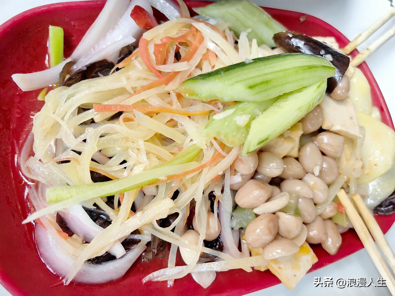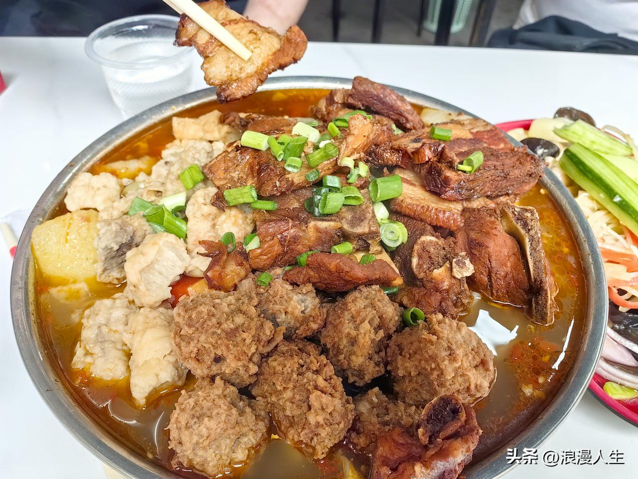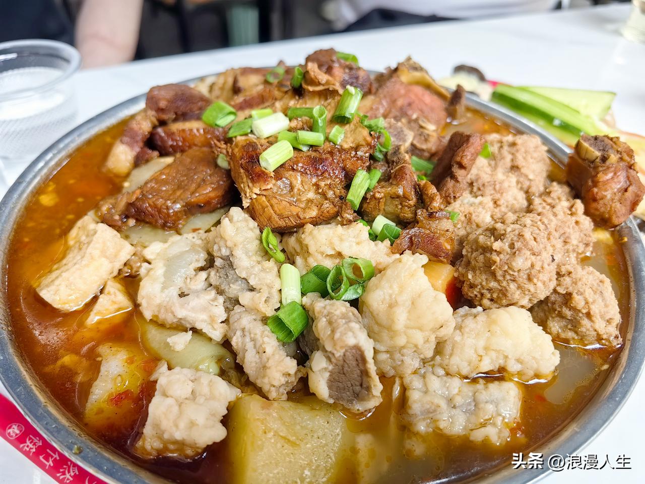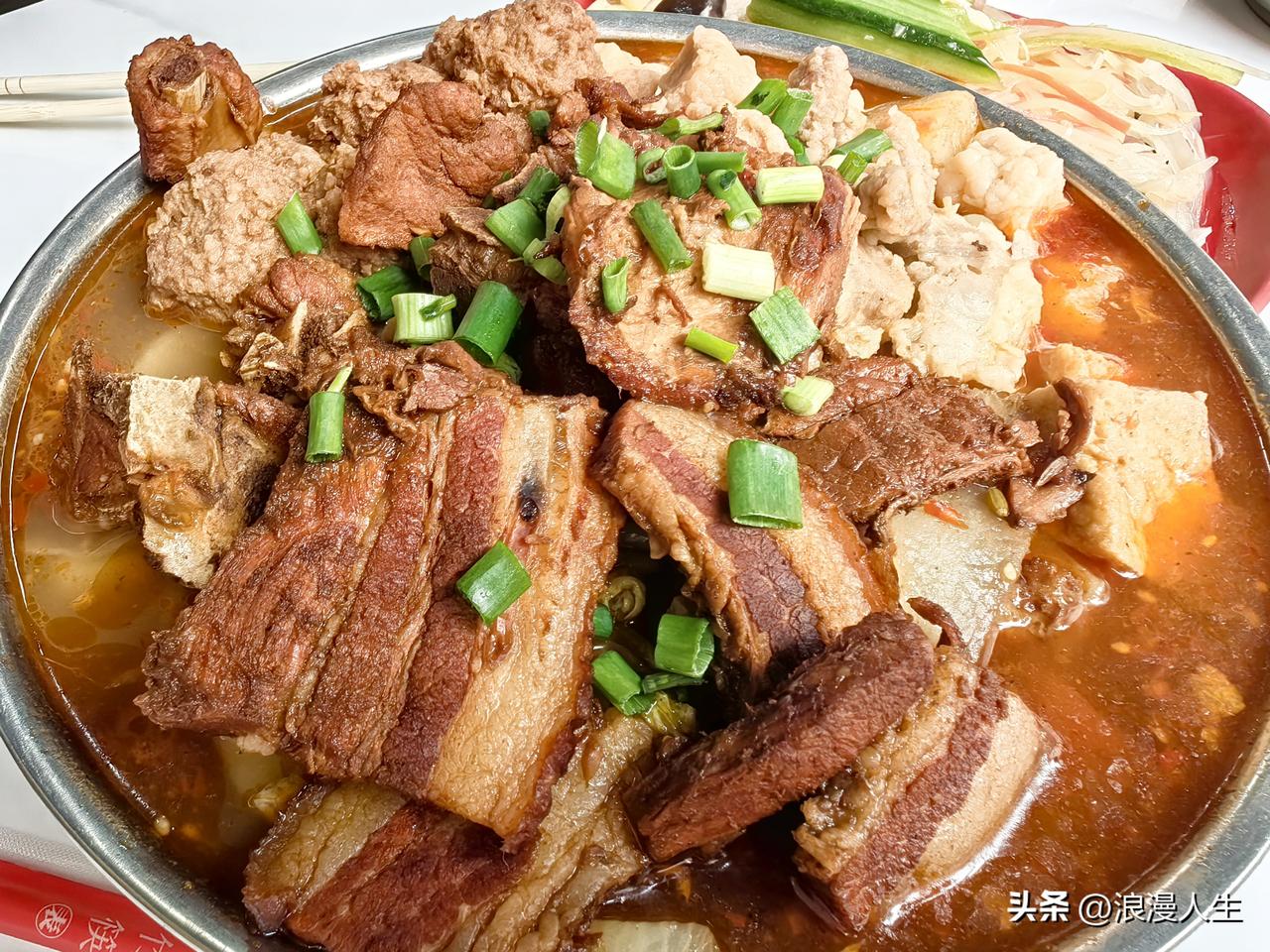 我们三个人,点了一份50元的(他们家烩菜价格有40.50.60.70.80 )。上菜后我真的惊呆了,整整一大盆,上面有4种肉量是特别的大,有排骨,肉丸子,炸鸡块,五花肉片,配菜有土豆,红白萝卜,蒜苗,粉条,木耳,白菜,洛南豆腐干,竹笋等等,真的是太丰盛了。我最推荐的是他们家的凉菜和红豆大米饭,特别是凉菜具有地方特色,由洛南豆腐干,山阳木耳,魔芋等搅拌而成。