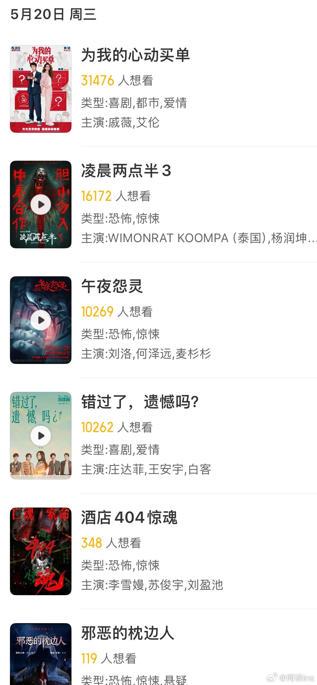 今年5.20上映的电影:《为我的心动买单》(心动保单)戚薇、艾伦、郑业成、蒋依依、梓渝、易梦玲、王成思《错过了,遗憾吗?》庄达菲、王安宇、白客、敖子逸泰国电影《错时告白》 恐怖片《凌晨三点半》,《午夜怨灵》,《酒店404惊魂》《邪恶的枕边人》《午夜哭声》