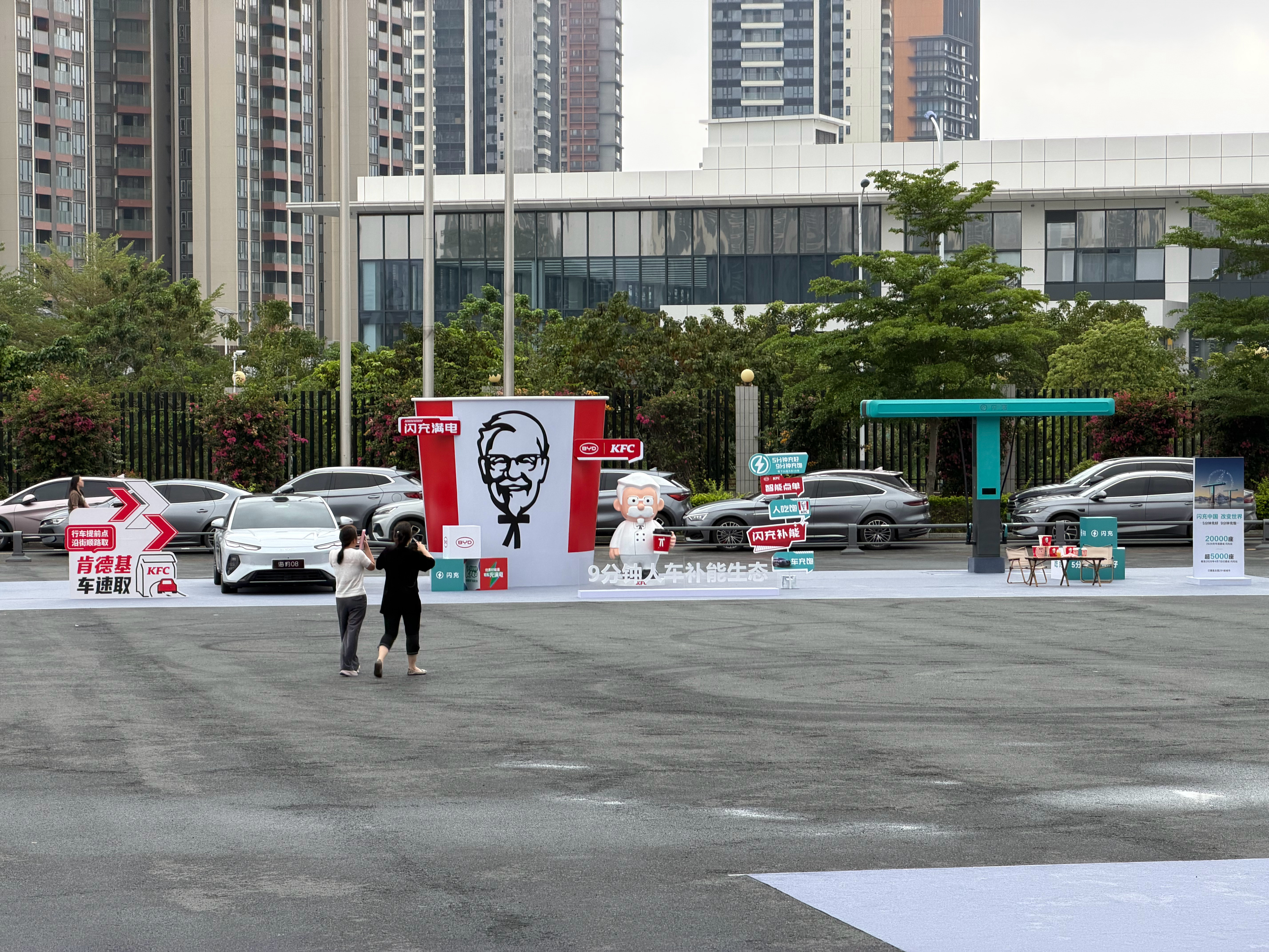 比亚迪x肯德基。如果在肯德基旁边建闪充桩的话,那更爽了,刚买完吃的,充满了。一次