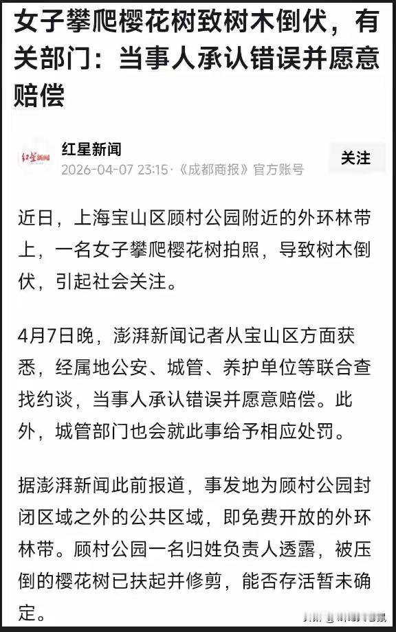 4月6日,上海顾村公园一段视频彻底火了。一名女游客为拍出绝美樱花照,直接爬上枝头摆造型,同伴在树下举着手机耐心等待。谁也没料到,下一秒整棵樱花树轰然倒地,连带着树根都被扯断,游客重重摔在地上,场面既尴尬又让人愤怒。