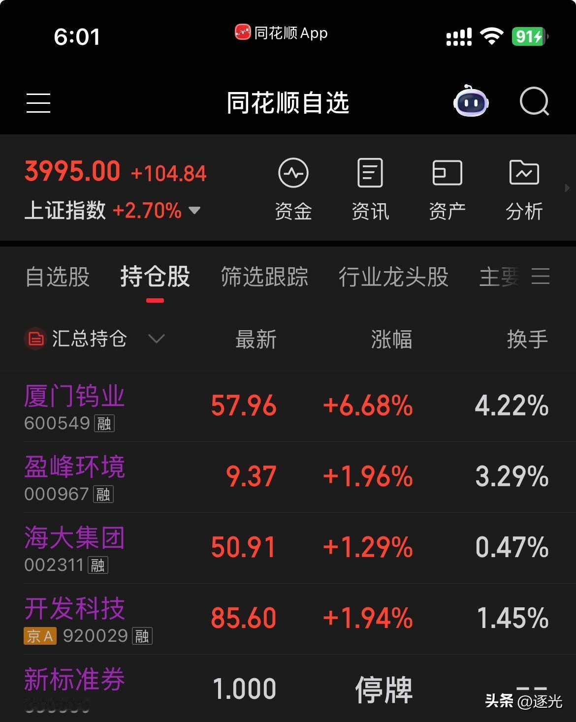 受昨夜美伊停战消息的影响,今天股市报复性反弹,成交量大幅放大,个股呈现普涨行情,由于我仓位比较低,今天赚得不多,主要得益金盘的大涨撑了点门面,盘中盈峰一度跌1个多点也是醉了。今天高清了金盘,早盘买了点开发,下午忍不住买了点厦钨。早盘也加了点ETF,目前股票仓位依然保持不变2成半。今天赚了3千2,远远跑输大盘。