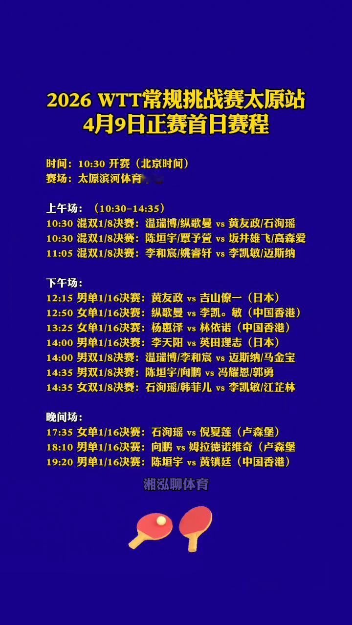 2026WTT常规挑战赛太原站4月9日正赛首日赛程。