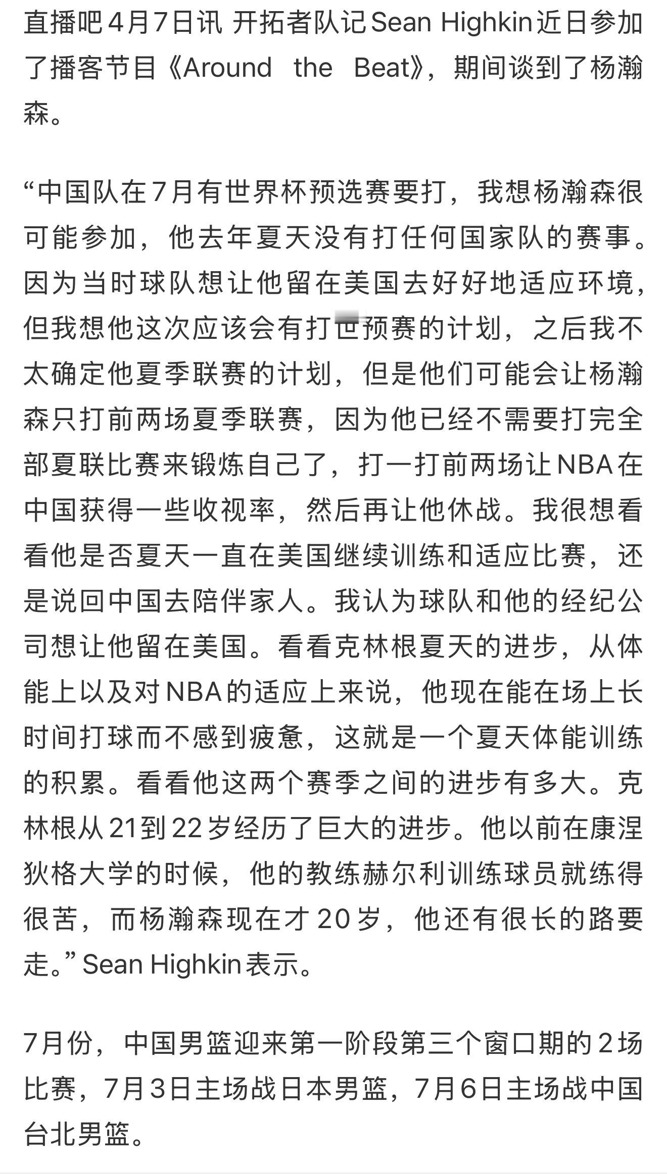 开拓者跟队记者:杨瀚森今年夏天可能会回来打世预赛