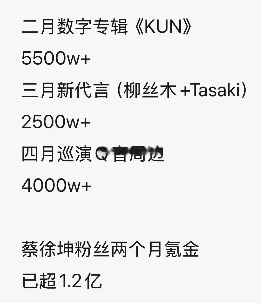 世界巨星蔡徐坤的商业价值——蔡徐坤巡演周边上线仅五天 ,销售额已超4000w!保守估算,近两个月蔡徐坤的音乐专辑,代言,演唱会相关,粉丝消费已超1.2亿➕。