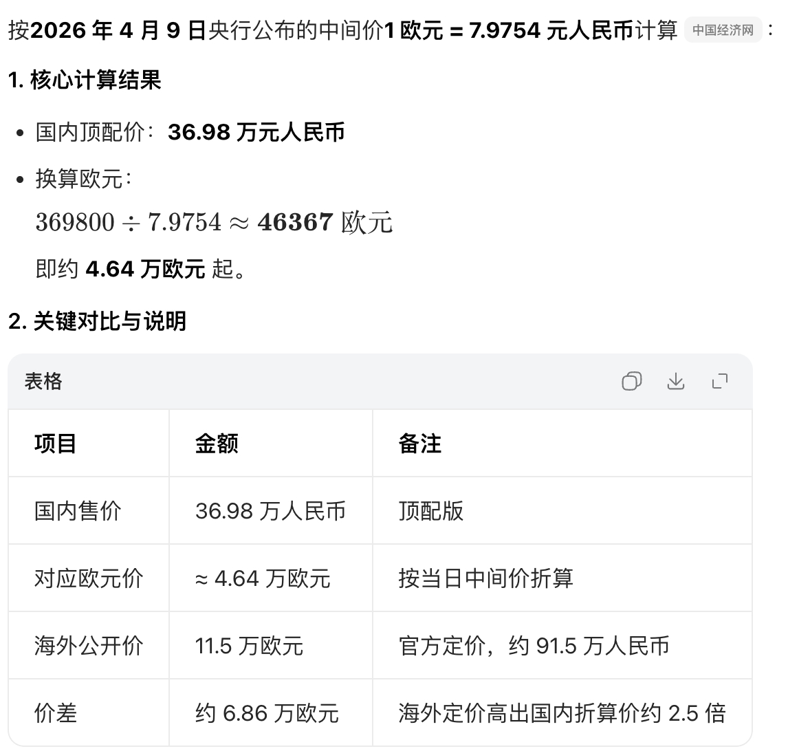 如果这种算法有些偏激了的话,那我们换个算法:就按同样的价格中国欧洲看齐:在欧洲起售价就是 4.64 万欧元!现在是多少?11.5万欧!