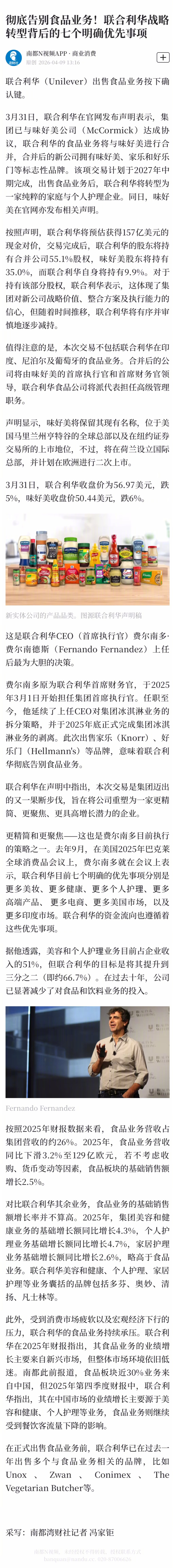 费尔南多原为联合利华首席财务官,于2025年3月1日开始担任集团首席执行官。任职至今,他延续了上任CEO对集团冰淇淋业务的拆分策略,并于2025年底正式完成集团冰淇淋业务的剥离。此次出售家乐(Knorr)、好乐门(Hellmann's)等品牌,意味着联合利华彻底告别食品业务。