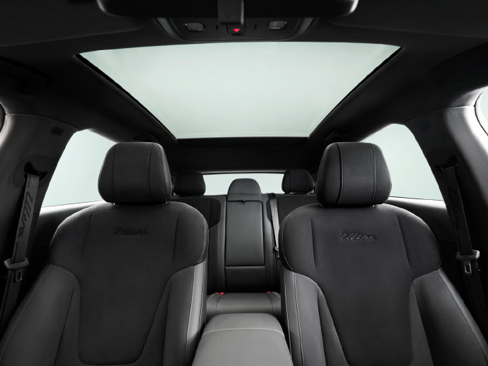 座椅是仿麂皮一体式运动座椅,靠背上的「Ultra」刺绣精致不浮夸。从图片看,侧翼和肩部明显加高,坐进去应该很有包裹感。更难得的是,前排座椅同时给了通风、加热和按摩功能。