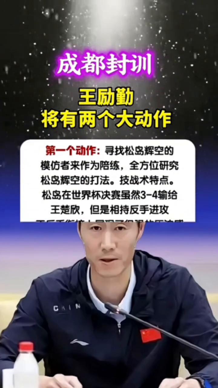 ·第一个动作:寻找松岛辉空的模仿者来作为陪练,全方位研究松岛辉空的打法、技战术特点。松岛在世界杯决赛虽然3-4输给王楚欣,但是相持反手进攻正反手衔接上展现了很强的压迫感和实力。在目前国乒除了王楚钦,其他人还真没把握赢他,研究松岛已经刻不容缓。