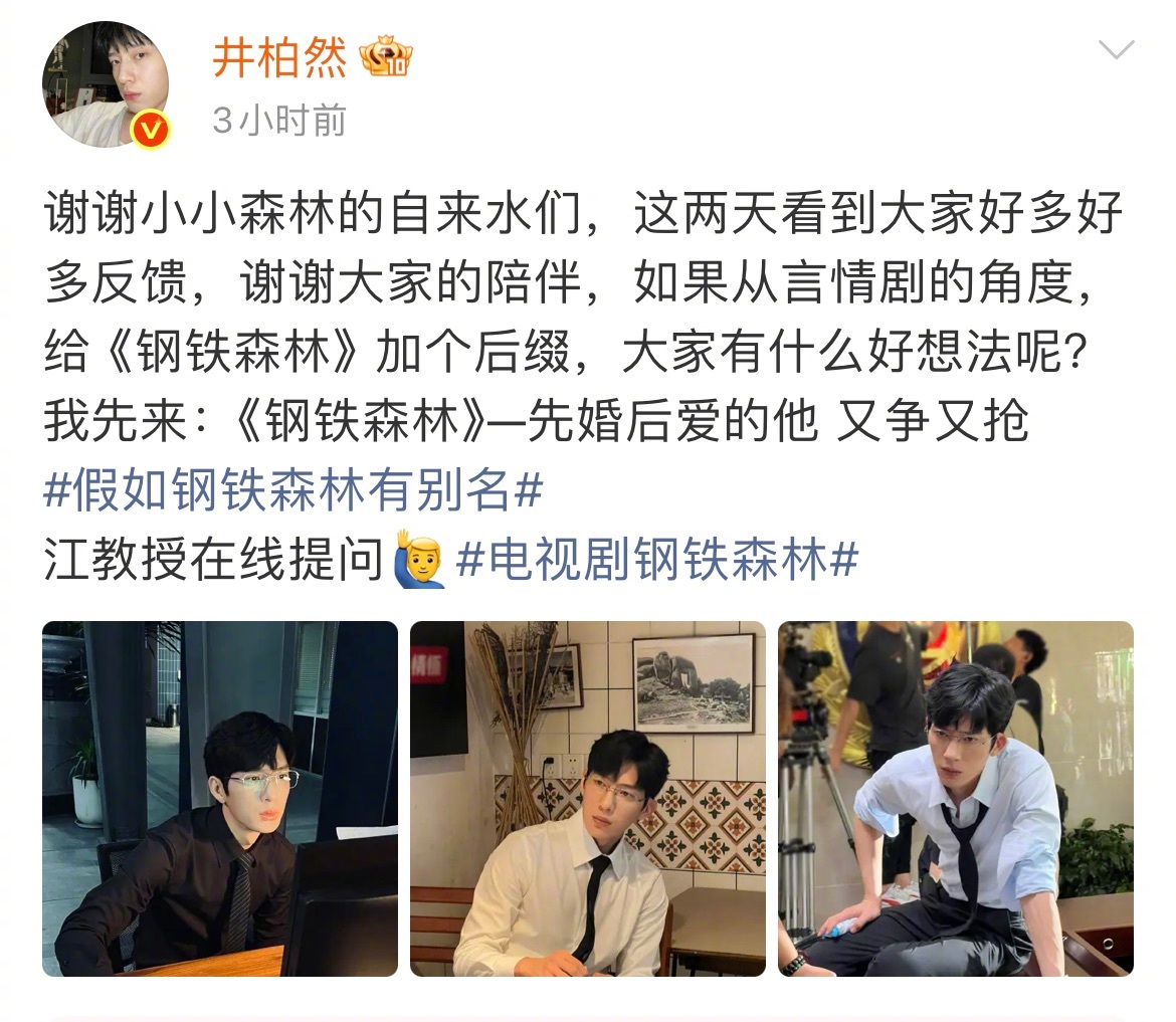 井柏然感谢钢铁森林观众 小小森林的自来水们真的赢麻了!追剧追到集体给《钢铁森林》改名,每一个新剧名都精准踩中言情爽点!井柏然不仅认真看大家的反馈,还陪着玩剧名后缀,发现他对角色理解的非常透彻,真的有点东西,看得出来对这部剧特别用心了!假如给钢铁森林改个名