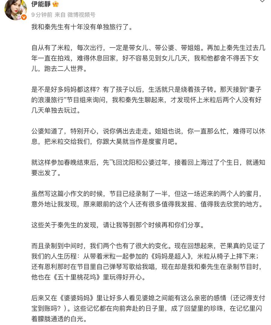 伊能静新综艺开播长文伊能静千字长文谈新节目 从产后焦虑到从容自信,伊能静这一路的变化在长文里全写出来了。她说初心未改爱意更浓,光是这句话就让人想哭。