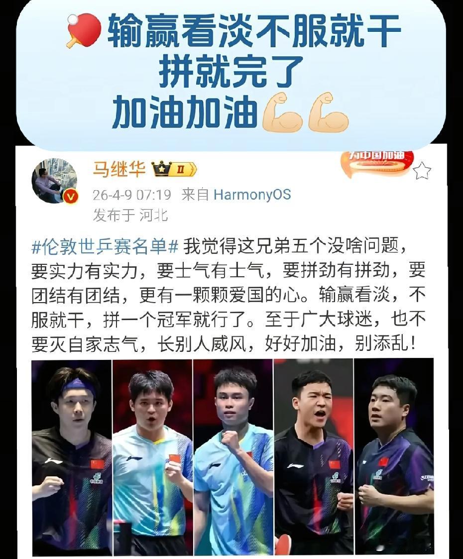 干就完了,百年世乒赛,拼过命,输赢都可以,毕竟这阵容确实没有以前的强,这是实话,但是还是相信他们,特别团体赛,他们会拼命的,我们只需要为他们加油[赞]