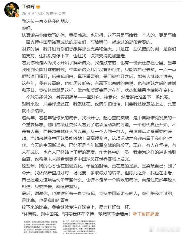 【丁俊晖说只要球桌还在我就还在丁俊晖说为赵心童感到自豪】4月9日,在个人社交账号发长文回信球迷,说这些年,自己有过高峰,也经历过低谷;有赢下比赛时的喜悦,也有输球之后的遗憾和不甘。竞技体育就是这样,掌声和质疑会同时存在,状态和结果也始终在变化。一个球员能做的,其实很简单——面对它,接受它,然后继续准备下一场比赛。这两年,看着年轻球员的成长,自己很开心。赵心童的突破,是中国斯诺克发展的一个重要标志。他用成绩让更多人看到了这项运动新的可能。今天的中国斯诺克,已经不是当年孤军奋战的阶段了。现在,有人在坚持,有人在成长,也有人已经站上了新的高度。作为其中的一员,我会为这样的进步感到自豪,也希望未来能看到更多中国球员在世界赛场上发光。他还说,这些年心态也在慢慢变化。年轻的时候,更在意的是赢,是突破自己;到了今天,自己依然希望打好每一场比赛,争取最好的结果。但除此之外,自己也在思考,自己还能为这项运动带来些什么。也许不是某一个阶段的成绩,而是让更多年轻人相信:只要热爱,就值得坚持。