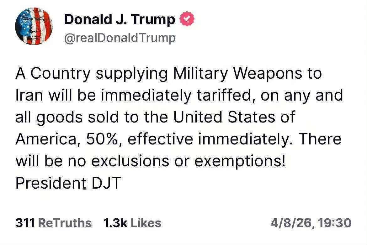 信息来源:特朗普威胁对向伊朗供武国家加征50%关税——2026-04-08 19:48·央视新闻