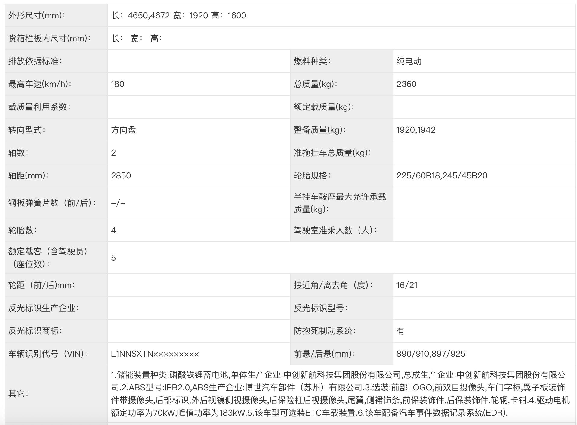 新车长宽高尺寸分别为 4650/4672*1920*1600mm,轴距2850mm。中创新航的磷酸铁锂电池。选装车门字标有一个“roam”,可以猜猜代表啥 新车情报局