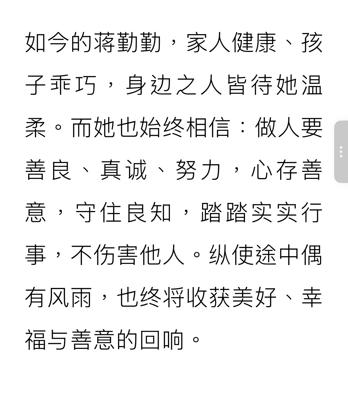 蒋勤勤在采访中坦言自己是被生活格外眷顾的人,暂别荧幕仍有好角色找上门,家人健康、孩子懂事,身边满是温柔她也始终以善良真诚踏实前行,不慌不忙活成自己的大女主。