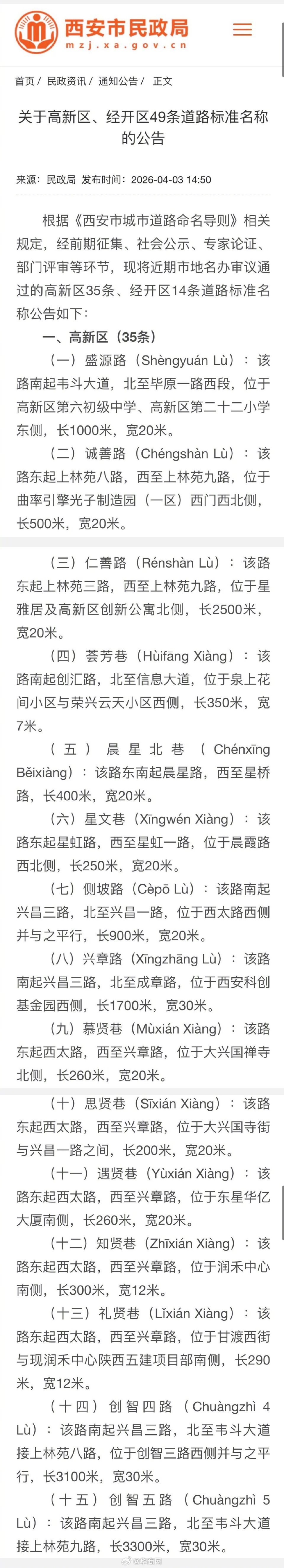 【#西安这49条道路的名字定了#!】根据《西安市城市道路命名导则》相关规定,经前期征集、社会公示、专家论证、部门评审等环节,现将近期市地名办审议通过的高新区35条、经开区14条道路标准名称公告如下:详情戳链接➡️网页链接 (西安发布)