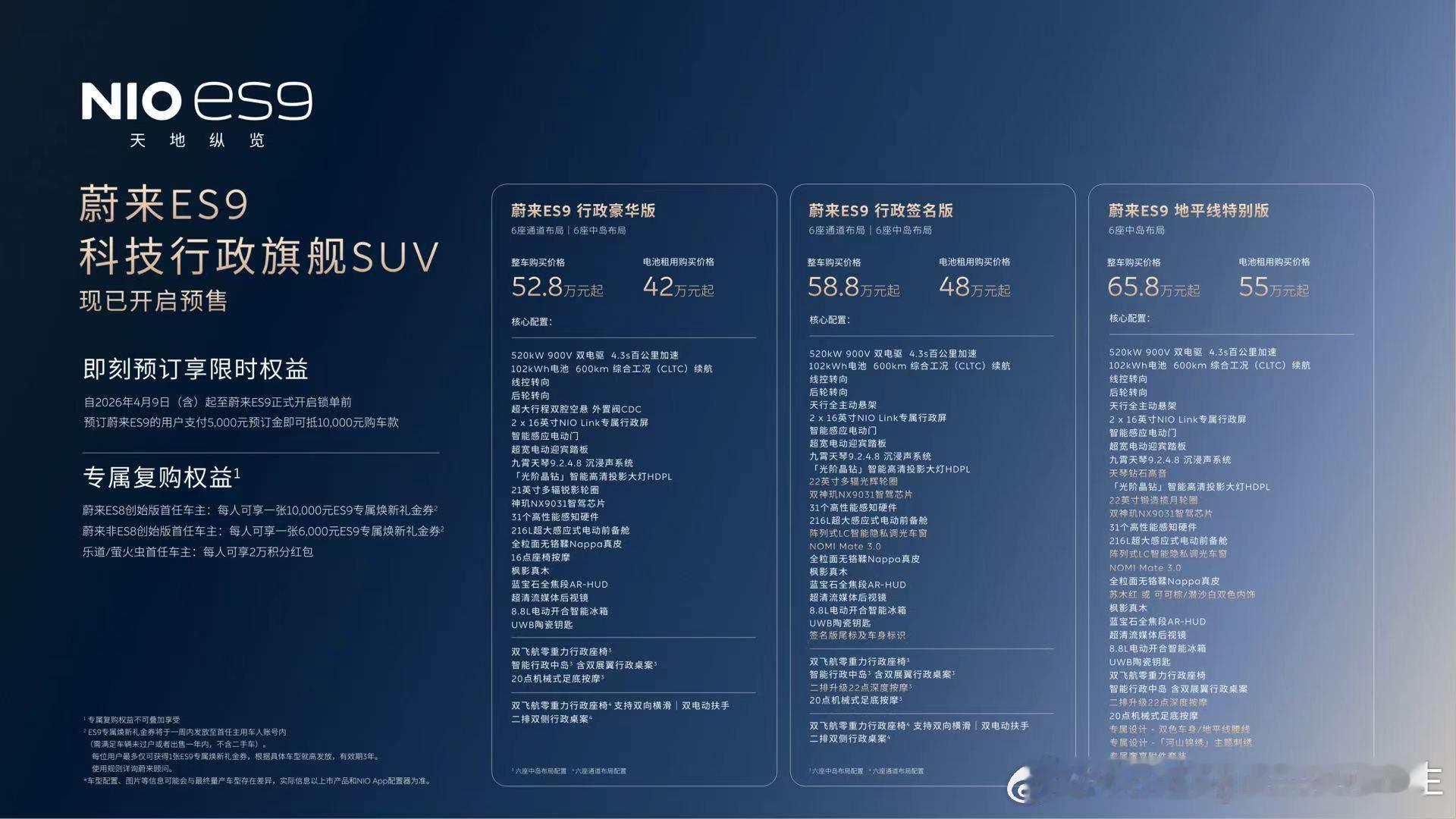 蔚来ES9中国元素蔚来ES9价格:6座行政豪华整车:52.8万;电池租用: 42万。