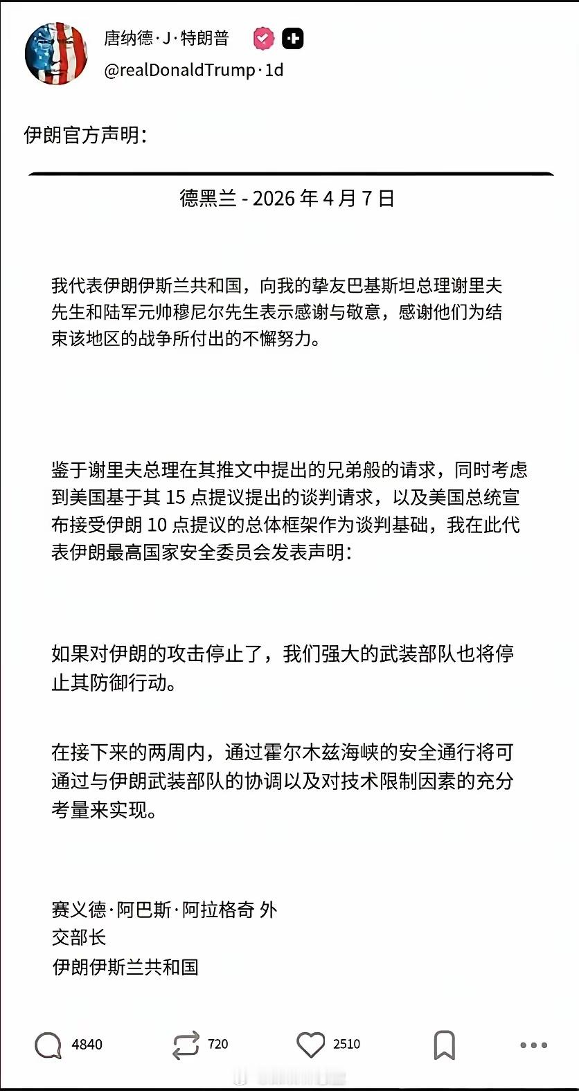 懂王公开不认账了,说媒体公开的伊朗提出的停战10条是假的。但互联网是有记忆的,他忘了他昨天亲自把伊朗外长阿拉格齐的声明挂在“真实社交”上的事儿了,阿拉格齐的声明中明确写着懂王接受了伊朗提出的停战10条为谈判基础。结果这才过了一天,懂王就不认账了。懂王就是这样,昨天的懂王说的啥,和今天的懂王没有关系,甚至是早上的懂王说的啥与下午的懂王都没关系。如果懂王只是个商人倒也无所谓,问题在于他现在是美国总统,如此言而无信让别人还怎么和他打交道。